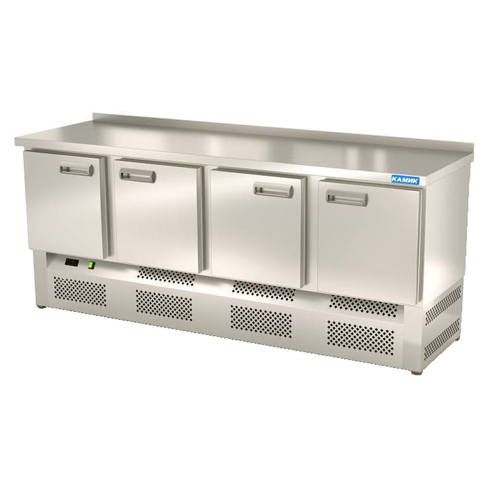 Холодильный стол КАМИК СОБН-40208 используется на предприятиях общественного питания и торговли для охлаждения и хранения продуктов, напитков и готовых блюд. Конструкция разделена на секции, каждая секция с дверью оснащена полкой сетчатой и парой направляющих. Корпус выполнен из нержавеющей стали AISI 430 толщиной 1 мм, столешница - из нержавеющей стали AISI 304 толщиной 1,5 мм.