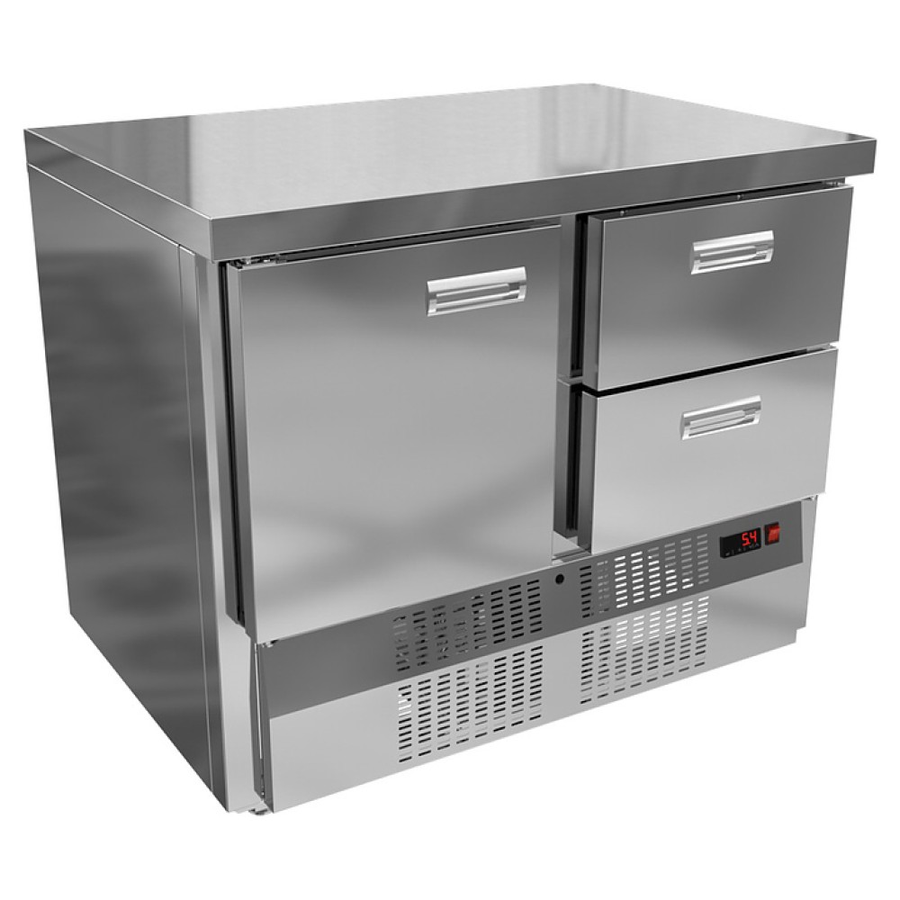 Холодильный стол KRONER СХ 1/2я-100-70 предназначен для хранения предварительно охлажденных пищевых продуктов и обработки ингредиентов в процессе приготовления блюд. Модель оснащена встроенным компрессорным холодильным агрегатом с нижним расположением, столешницей без борта, электронной панелью управления и холодильной камерой с 2 секциями: 1 с распашной дверью и 1 с 2 выдвижными ящиками. Корпус и столешница выполнены из шлифованной нержавеющей стали, задняя стенка – из оцинкованной стали.