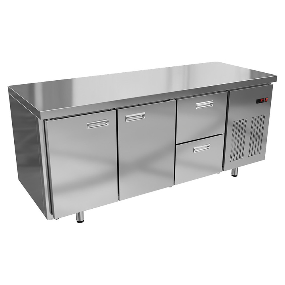 Холодильный стол KRONER СХ 2/2я-180-60 предназначен для хранения предварительно охлажденных пищевых продуктов и обработки ингредиентов в процессе приготовления блюд. Модель оснащена встроенным компрессорным холодильным агрегатом с боковым расположением, столешницей без борта, электронной панелью управления и холодильной камерой с 3 секциями: 1 с 2 выдвижными ящиками и 2 с распашными дверьми. Корпус и столешница выполнены из шлифованной нержавеющей стали, задняя стенка – из оцинкованной стали.