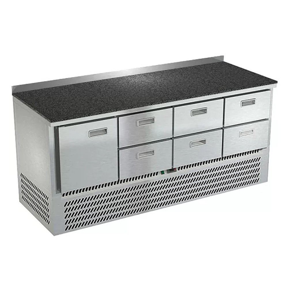 Холодильный стол Техно-ТТ СПН/О-422/16-1906 предназначен для раскатки теста, обработки, охлаждения и кратковременного хранения продуктов и напитков на предприятиях общественного питания и торговли. Модель оснащена компрессором (Испания), каждая секция - направляющими и сетчатой полкой, двери и ящики - доводчиками. Корпус выполнен из нержавеющей стали, столешница из камня, задняя стенка и дно - из оцинкованной стали.