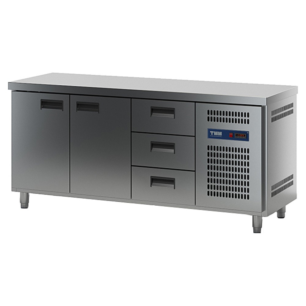 Холодильный стол ТММ СХСБ-1/2Д-3Я предназначен для раскатки теста, обработки ингредиентов для приготовления блюд, охлаждения и кратковременного хранения скоропортящихся продуктов и напитков на предприятиях общественного питания и торговли. Цельнозаливной корпус и фасад выполнены из нержавеющей стали AISI 340, задняя стенка - из оцинкованной стали.