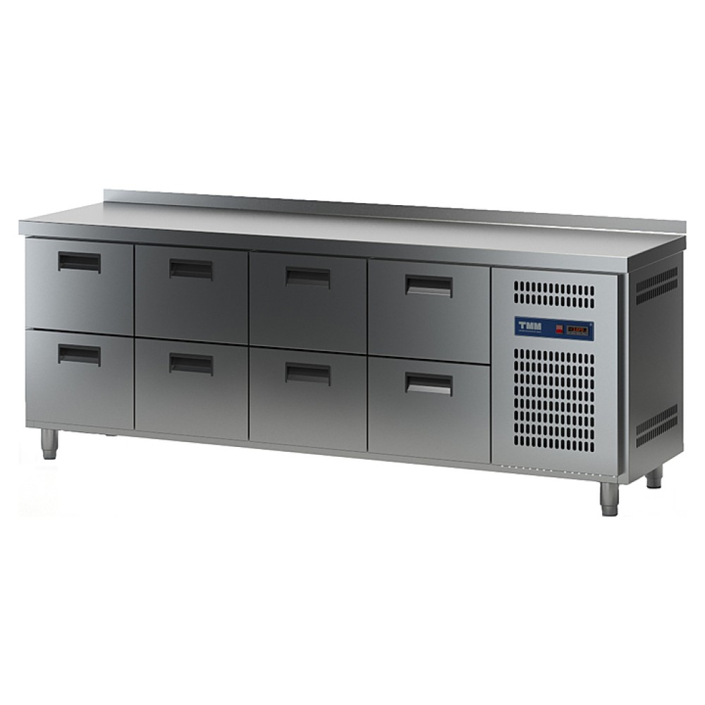 Холодильный стол ТММ СХСБ-2/8Я предназначен для раскатки теста, обработки ингредиентов для приготовления блюд, охлаждения и кратковременного хранения скоропортящихся продуктов и напитков на предприятиях общественного питания и торговли. Цельнозаливной корпус и фасад выполнены из нержавеющей стали AISI 340, задняя стенка - из оцинкованной стали.