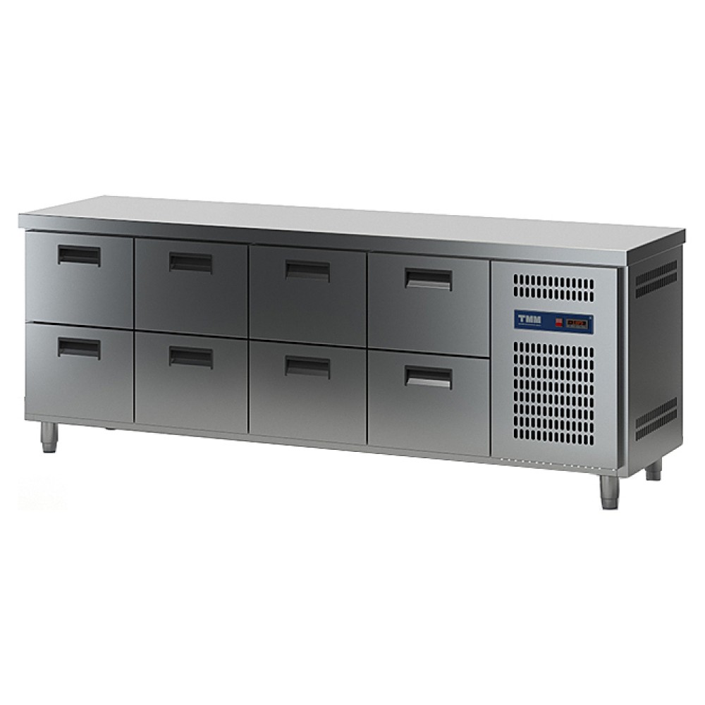 Холодильный стол ТММ СХСБ-К-1/8Я предназначен для раскатки теста, обработки ингредиентов для приготовления блюд, охлаждения и кратковременного хранения скоропортящихся продуктов и напитков на предприятиях общественного питания и торговли. Цельнозаливной корпус и фасад выполнены из нержавеющей стали AISI 340, задняя стенка - из оцинкованной стали.