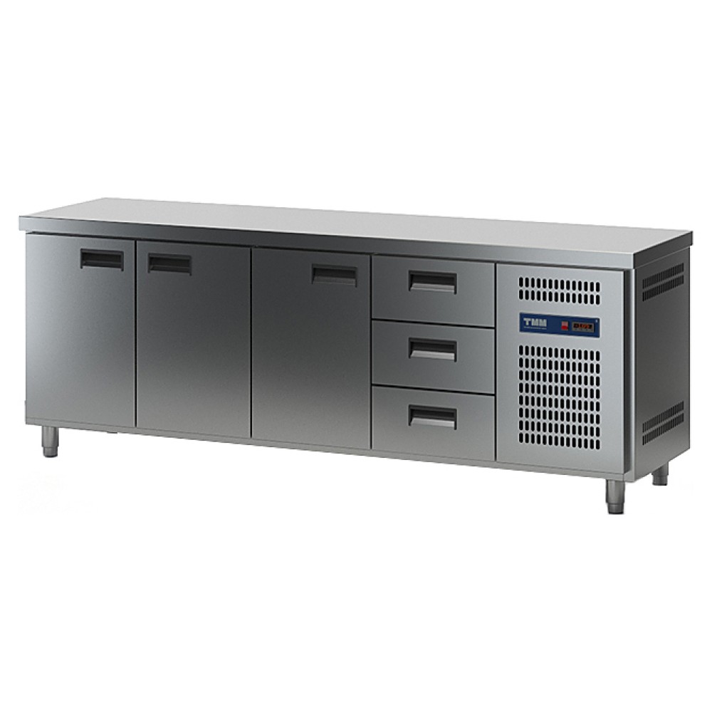 Холодильный стол ТММ СХСБ-К 2/3Д-3Я предназначен для раскатки теста, обработки ингредиентов для приготовления блюд, охлаждения и кратковременного хранения скоропортящихся продуктов и напитков на предприятиях общественного питания и торговли. Цельнозаливной корпус и фасад выполнены из нержавеющей стали AISI 340, задняя стенка - из оцинкованной стали.