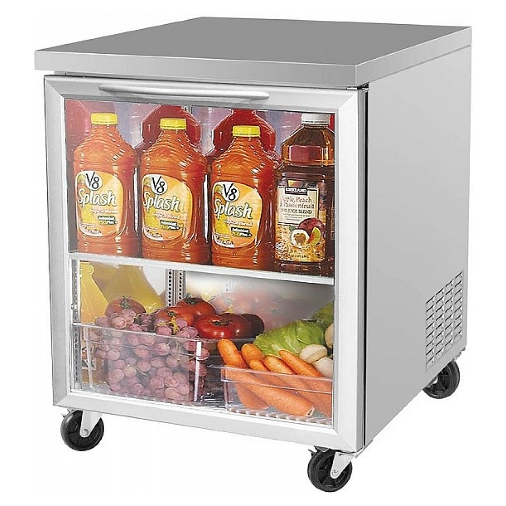 Холодильный стол Turbo air CMUR-28L-G предназначен для хранения предварительно охлажденных мясных и рыбных полуфабрикатов, заготовок для салатов, молочной продукции, охлажденных напитков и других пищевых продуктов на предприятиях общественного питания и торговли. Модель оснащена дверцей с двойным стеклопакетом и слоем прозрачной теплоизоляционной пленки, регулируемой полкой, и 4 колесами. Корпус и дверные петли выполнены из нержавеющей стали, полка - из толстой стальной проволоки с виниловым покрытием, уплотнение - из ABS-пластика.