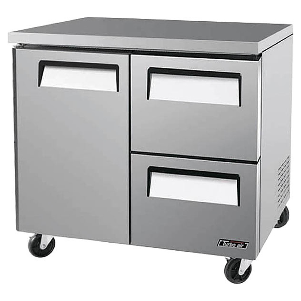 Холодильный стол Turbo air CMUR-36-2D-2 предназначен для раскатки теста, обработки, охлаждения и кратковременного хранения продуктов и напитков на предприятиях общественного питания и торговли. Корпус выполнен из нержавеющей стали (гальванизированная сталь на оборотной стороне и внизу) с применением пожаробезопасных стенок толщиной 60 мм, уплотнения - из АБС-пластика, пол - из нержавеющей стали с алюминиевыми вставками по бокам и сзади оборудования, регулируемые полки - из толстой стальной проволоки с виниловым покрытием, тройные направляющие - из высококачественной нержавеющей стали.