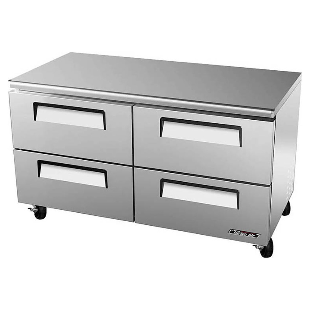 Холодильный стол Turbo air CMUR-60-2D-4 предназначен для раскатки теста, обработки, охлаждения и кратковременного хранения продуктов и напитков на предприятиях общественного питания и торговли. Корпус выполнен из нержавеющей стали (гальванизированная сталь на оборотной стороне и внизу) с применением пожаробезопасных стенок толщиной 60 мм, уплотнения - из АБС-пластика, пол - из нержавеющей стали с алюминиевыми вставками по бокам и сзади оборудования, регулируемые полки - из толстой стальной проволоки с виниловым покрытием, тройные направляющие - из высококачественной нержавеющей стали.