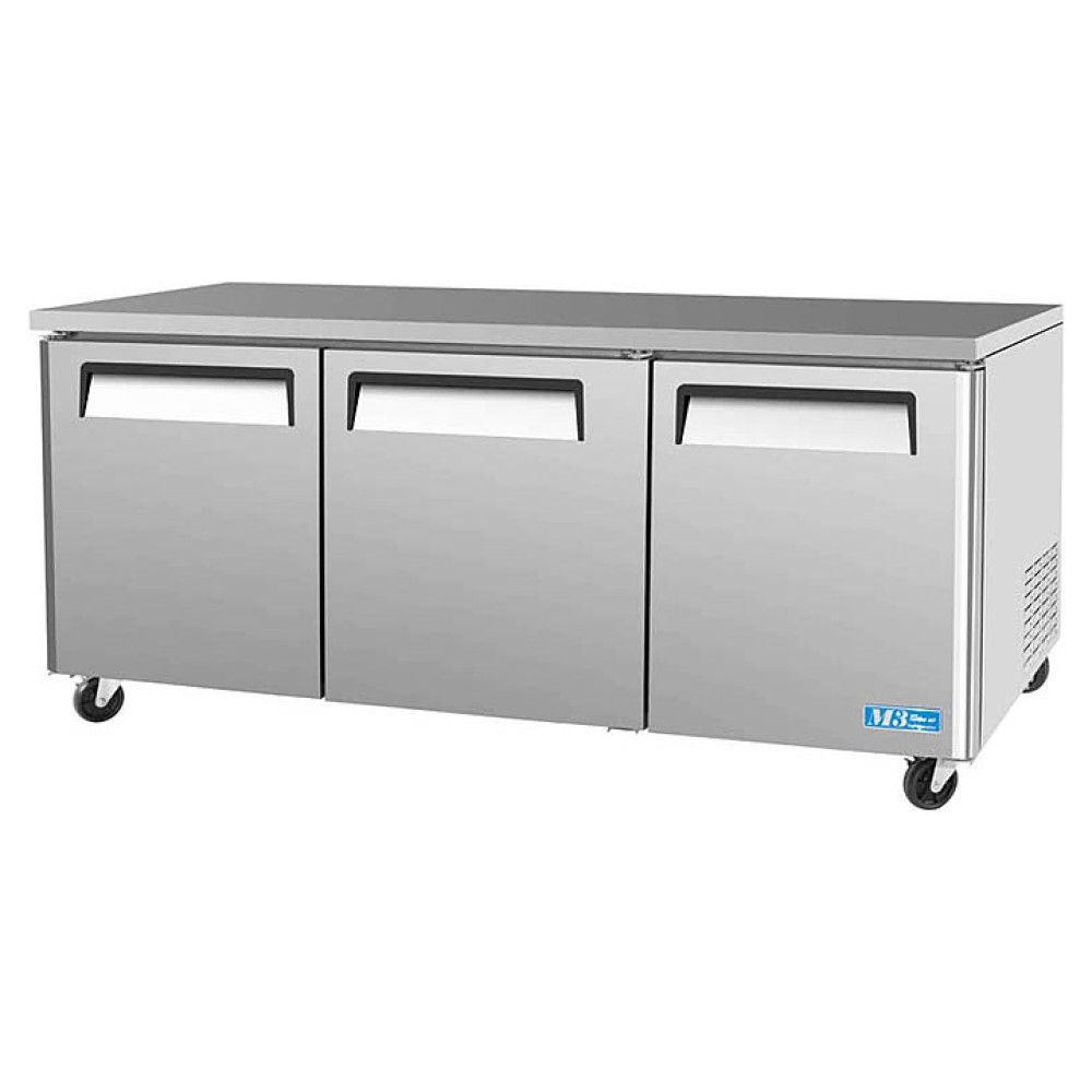 Холодильный стол Turbo air CMUR-72 предназначен для раскатки теста, обработки, охлаждения и кратковременного хранения продуктов и напитков на предприятиях общественного питания и торговли. Корпус выполнен из нержавеющей стали (гальванизированная сталь на оборотной стороне и внизу) с применением пожаробезопасных стенок толщиной 60 мм, уплотнения - из АБС-пластика, пол - из нержавеющей стали с алюминиевыми вставками по бокам и сзади оборудования, регулируемые полки - из толстой стальной проволоки с виниловым покрытием.