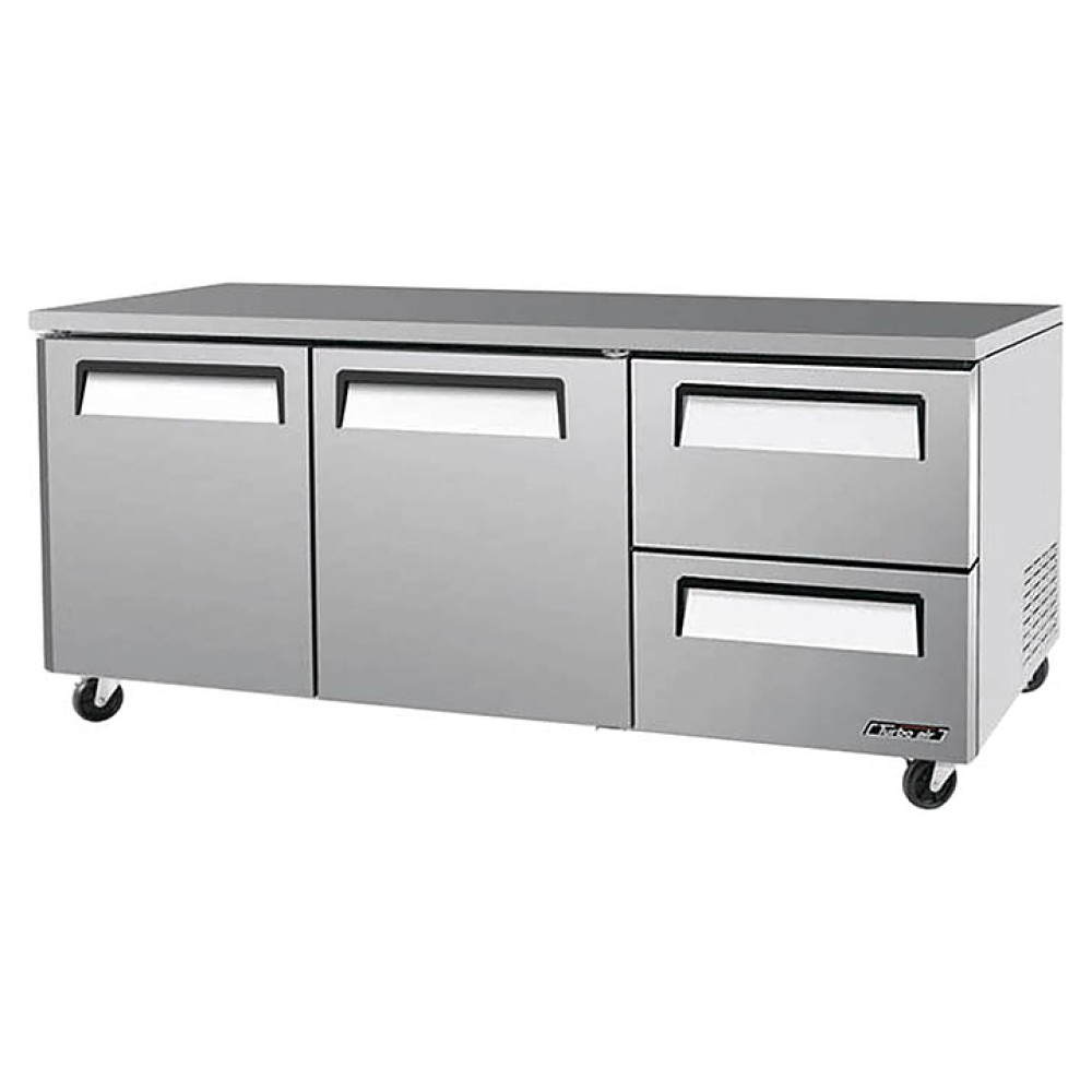 Холодильный стол Turbo air CMUR-72-2D-2 предназначен для раскатки теста, обработки, охлаждения и кратковременного хранения продуктов и напитков на предприятиях общественного питания и торговли. Корпус выполнен из нержавеющей стали (гальванизированная сталь на оборотной стороне и внизу) с применением пожаробезопасных стенок толщиной 60 мм, уплотнения - из АБС-пластика, пол - из нержавеющей стали с алюминиевыми вставками по бокам и сзади оборудования, регулируемые полки - из толстой стальной проволоки с виниловым покрытием, тройные направляющие - из высококачественной нержавеющей стали.