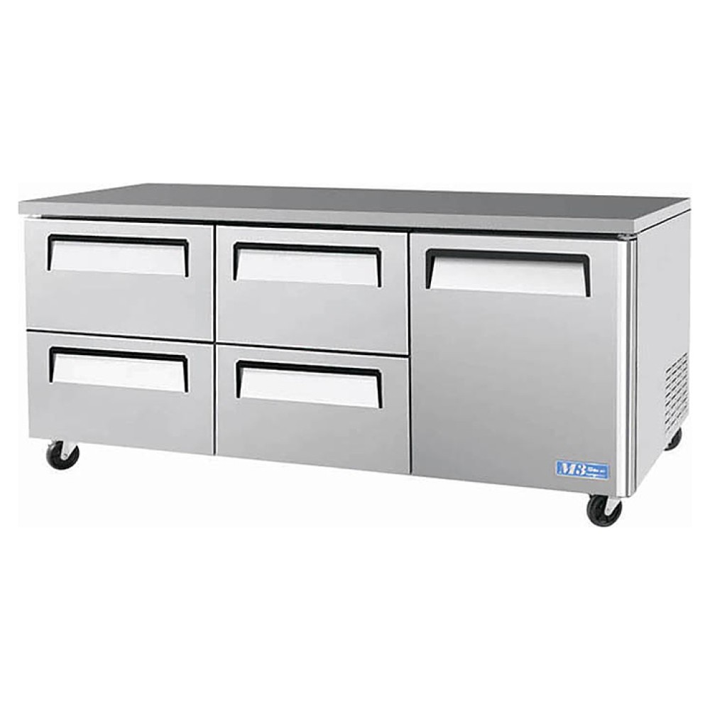 Холодильный стол Turbo air CMUR-72-2D-4 предназначен для раскатки теста, обработки, охлаждения и кратковременного хранения продуктов и напитков на предприятиях общественного питания и торговли. Корпус выполнен из нержавеющей стали (гальванизированная сталь на оборотной стороне и внизу) с применением пожаробезопасных стенок толщиной 60 мм, уплотнения - из АБС-пластика, пол - из нержавеющей стали с алюминиевыми вставками по бокам и сзади оборудования, регулируемые полки - из толстой стальной проволоки с виниловым покрытием, тройные направляющие - из высококачественной нержавеющей стали.