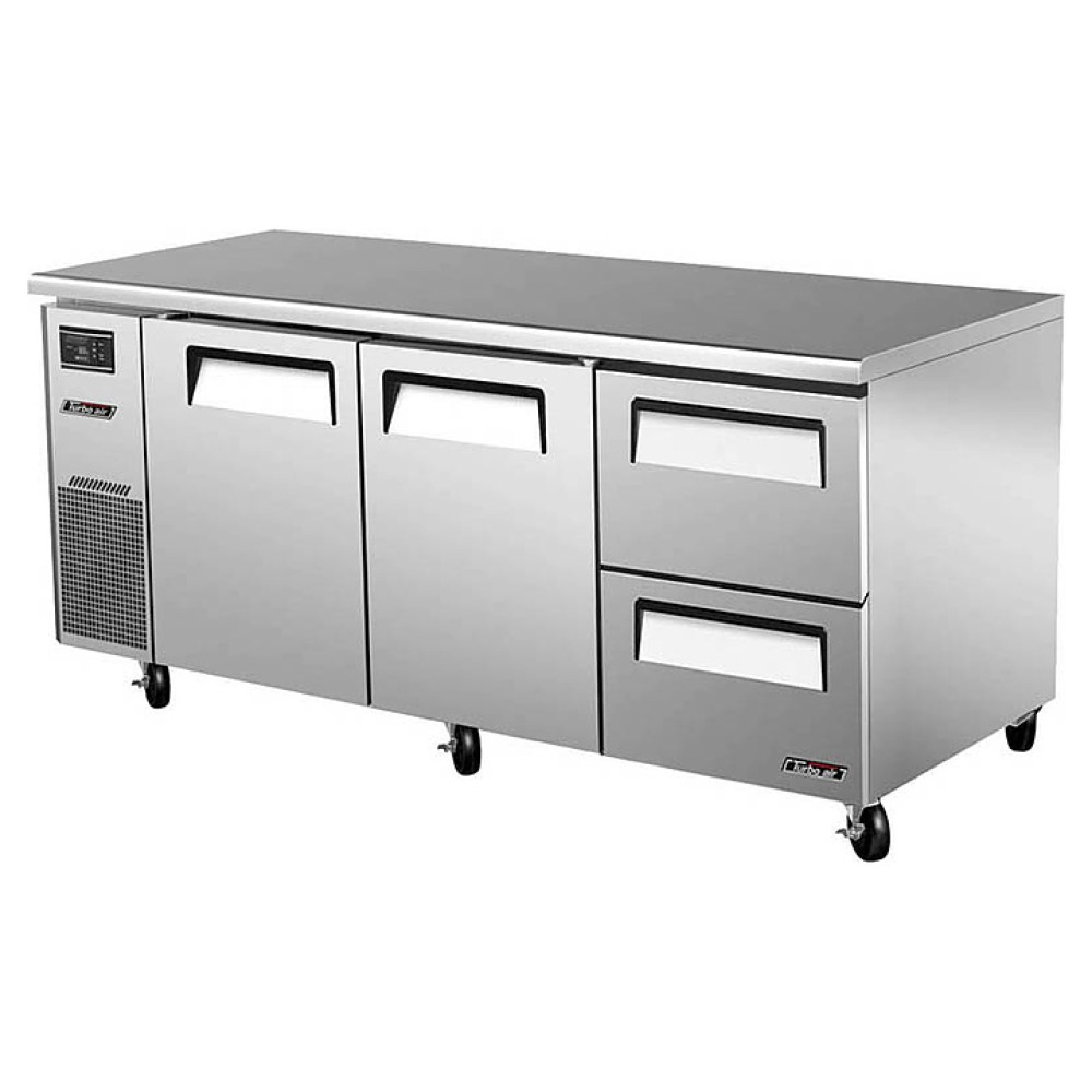 Холодильный стол Turbo air KUR18-2D-2 предназначен для раскатки теста, обработки, охлаждения и кратковременного хранения продуктов и напитков на предприятиях общественного питания и торговли. Корпус выполнен из нержавеющей стали (гальванизированная сталь на оборотной стороне и внизу) с применением пожаробезопасных стенок толщиной 60 мм, уплотнения - из АБС-пластика (акрилонитрилбутадиенстирола), не пропускающего конденсата, пол - из нержавеющей стали с алюминиевыми вставками по бокам и сзади оборудования, тройные направляющие - из высококачественной нержавеющей стали.
