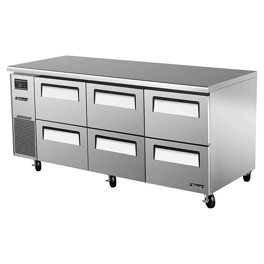 Холодильный стол Turbo air KUR18-2D-6 предназначен для раскатки теста, обработки, охлаждения и кратковременного хранения продуктов и напитков на предприятиях общественного питания и торговли. Модель оснащена 2 ящиками GN 1/1 глубиной 150 мм и 6 колесами. Корпус выполнен из нержавеющей стали (гальванизированная сталь на оборотной стороне и внизу) с применением пожаробезопасных стенок толщиной 60 мм, уплотнения - из АБС-пластика (акрилонитрилбутадиенстирола), не пропускающего конденсата, пол - из нержавеющей стали с алюминиевыми вставками по бокам и сзади оборудования, тройные направляющие - из высококачественной нержавеющей стали.