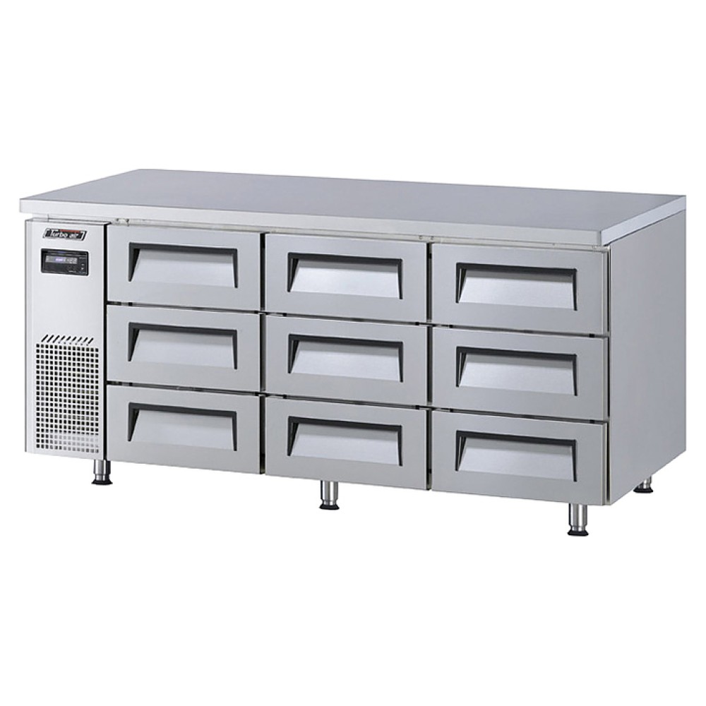 Холодильный стол Turbo air KUR18-3D-9 предназначен для охлаждения и кратковременного хранения скоропортящихся продуктов, теста и ингредиентов для приготовления пиццы в пекарнях, кондитерских, на предприятиях пищевой промышленности, общественного питания и торговли. Модель оснащена 9 ящиками GN 1/1 глубиной 100 мм. Корпус изделия выполнен из нержавеющей стали (гальванизированная сталь на оборотной стороне и внизу) с применением пожаробезопасных стенок толщиной 60 мм, уплотнения - из АБС-пластика (акрилонитрилбутадиенстирола), не пропускающего конденсата, пол - из нержавеющей стали с алюминиевыми вставками по бокам и сзади, 6 регулируемых ножек - из нержавеющей стали.
