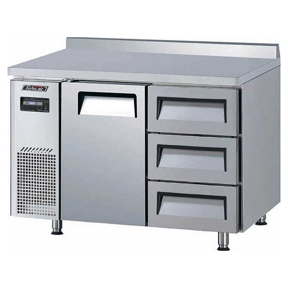 Холодильный стол Turbo air KWR12-3D-3 предназначен для раскатки теста, обработки, охлаждения и кратковременного хранения продуктов и напитков на предприятиях общественного питания и торговли. Корпус выполнен из нержавеющей стали (гальванизированная сталь на оборотной стороне и внизу) с применением пожаробезопасных стенок толщиной 60 мм, уплотнения - из АБС-пластика (акрилонитрилбутадиенстирола), не пропускающего конденсата, пол - из нержавеющей стали с алюминиевыми вставками по бокам и сзади оборудования, тройные направляющие - из высококачественной нержавеющей стали.