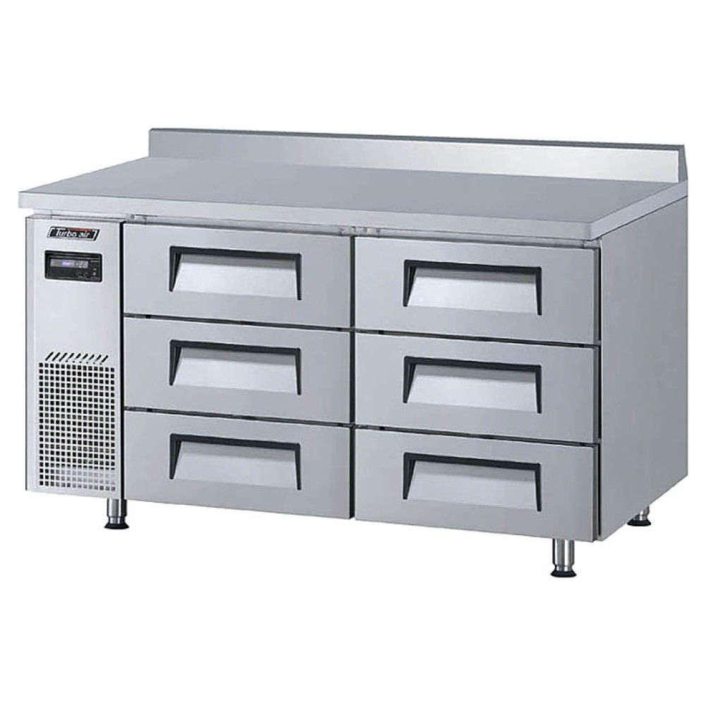 Холодильный стол Turbo air KWR15-3D-6 предназначен для раскатки теста, обработки, охлаждения и кратковременного хранения продуктов и напитков на предприятиях общественного питания и торговли. Корпус выполнен из нержавеющей стали (гальванизированная сталь на оборотной стороне и внизу) с применением пожаробезопасных стенок толщиной 60 мм, уплотнения - из АБС-пластика (акрилонитрилбутадиенстирола), не пропускающего конденсата, пол - из нержавеющей стали с алюминиевыми вставками по бокам и сзади оборудования, тройные направляющие - из высококачественной нержавеющей стали.