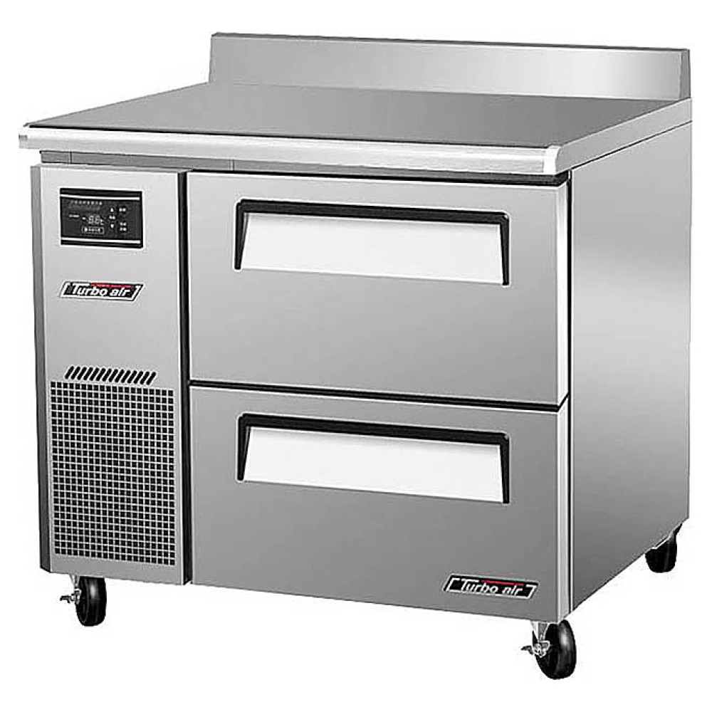 Холодильный стол Turbo air KWR9-2D-2 предназначен для раскатки теста, обработки, охлаждения и кратковременного хранения продуктов и напитков на предприятиях общественного питания и торговли. Корпус выполнен из нержавеющей стали (гальванизированная сталь на оборотной стороне и внизу) с применением пожаробезопасных стенок толщиной 60 мм, уплотнения - из АБС-пластика (акрилонитрилбутадиенстирола), не пропускающего конденсата, пол - из нержавеющей стали с алюминиевыми вставками по бокам и сзади оборудования, тройные направляющие - из высококачественной нержавеющей стали.