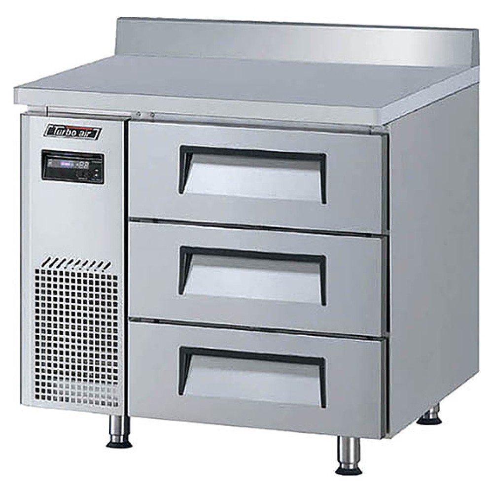 Холодильный стол Turbo air KWR9-3D-3 предназначен для раскатки теста, обработки, охлаждения и кратковременного хранения продуктов и напитков на предприятиях общественного питания и торговли. Корпус выполнен из нержавеющей стали (гальванизированная сталь на оборотной стороне и внизу) с применением пожаробезопасных стенок толщиной 60 мм, уплотнения - из АБС-пластика (акрилонитрилбутадиенстирола), не пропускающего конденсата, пол - из нержавеющей стали с алюминиевыми вставками по бокам и сзади оборудования, тройные направляющие - из высококачественной нержавеющей стали.