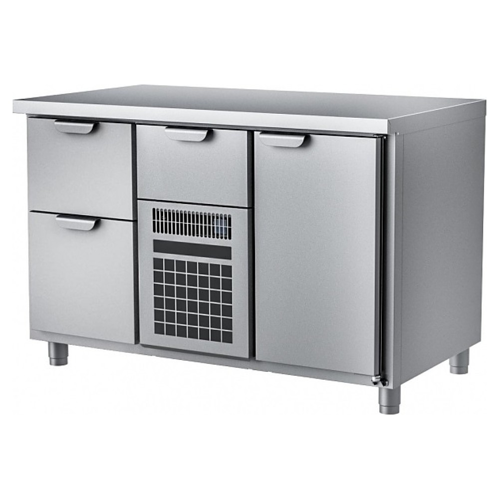 Морозильный стол HappyChef TF GH 2-FBR-1 предназначен для хранения предварительно замороженных пищевых продуктов и обработки ингредиентов в процессе приготовления блюд на предприятиях общественного питания и торговли. Модель оснащена секцией с компрессорным холодильным агрегатом со съемной холодильной кассетой (Россия) с нижним центральным расположением и верхним выдвижным ящиком, секцией с глухой распашной дверью справа и секцией с 2 выдвижными ящиками слева, усиленной столешницей без борта и электронной панелью управления, дверь и ящики имеют короткие горизонтальные рукоятки в верхней части. Корпус выполнен из нержавеющей стали марки AISI 430, столешница – из нержавеющей стали марки AISI 304.