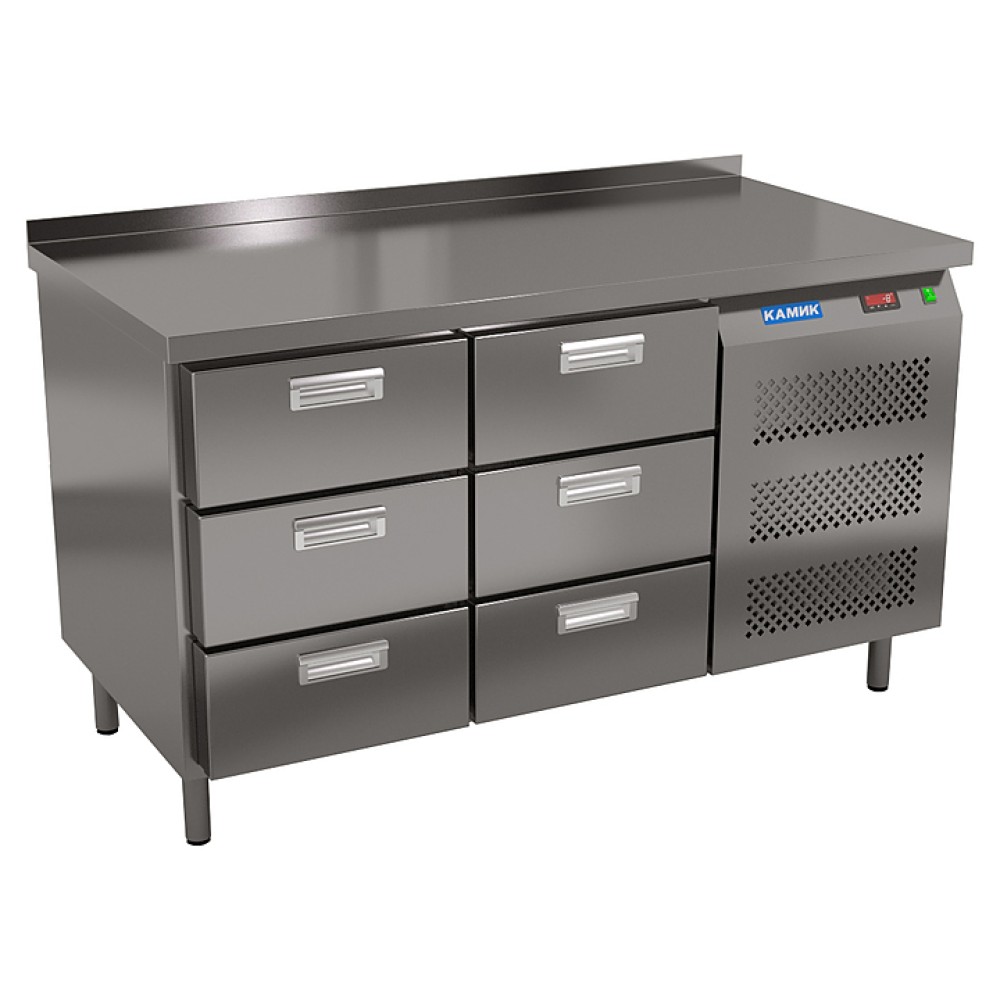 Морозильный стол КАМИК СМБ-061858 используется на предприятиях общественного питания и торговли для заморозки и длительного хранения продуктов, полуфабрикатов и мороженого. Конструкция разделена на секции, каждая секция с дверью оснащена полкой сетчатой и парой направляющих. Корпус выполнен из нержавеющей стали AISI 430 толщиной 1 мм, столешница - из нержавеющей стали AISI 304 толщиной 1,5 мм.