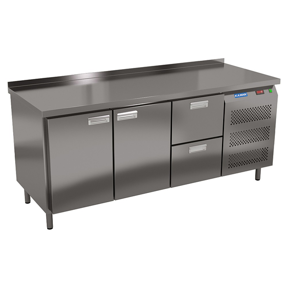 Морозильный стол КАМИК СМБ-221858 используется на предприятиях общественного питания и торговли для заморозки и длительного хранения продуктов, полуфабрикатов и мороженого. Конструкция разделена на секции, каждая секция с дверью оснащена полкой сетчатой и парой направляющих. Корпус выполнен из нержавеющей стали AISI 430 толщиной 1 мм, столешница - из нержавеющей стали AISI 304 толщиной 1,5 мм.