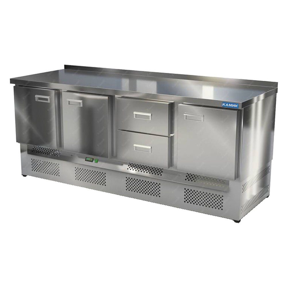 Морозильный стол КАМИК СМНБ-32207 используется на предприятиях общественного питания и торговли для заморозки и длительного хранения продуктов, полуфабрикатов и мороженого. Конструкция разделена на секции, каждая секция с дверью, оснащена полкой сетчатой и парой направляющих. Корпус выполнен из нержавеющей стали AISI 430 толщиной 1 мм, столешница - из нержавеющей стали AISI 304 толщиной 1,5 мм.