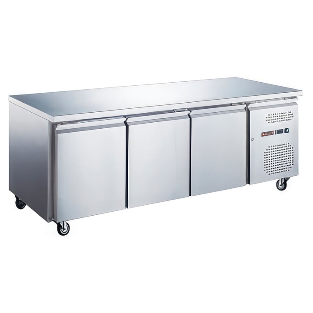 Морозильный стол Tatra TRTGN3 BT предназначен для хранения замороженных ингредиентов и готовых блюд на предприятиях общественного питания и торговли. Модель оснащена встроенным холодильным агрегатом с боковым расположением, цифровым термостатом, 3 глухими самозакрывающимися дверьми с магнитным уплотнителем и 4 колесами, 2 из которых со стопором. Корпус и столешница выполнены из высококачественной нержавеющей стали.