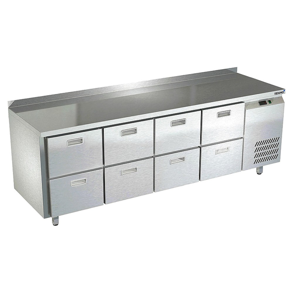 Морозильный стол Техно-ТТ СПБ/М-223/08-2206 предназначен для раскатки теста, обработки, заморозки и долговременного хранения продуктов, полуфабрикатов, напитков и мороженого на предприятиях общественного питания и торговли. Модель оснащена 4 секциями с 8 ящиками, направляющими с доводчиками (Австрия), бортом и круглыми ножками, регулируемыми по высоте на 50 мм (Италия). Корпус и столешница выполнены из нержавеющей стали AISI 430, задняя стенка и дно - из оцинкованной стали.