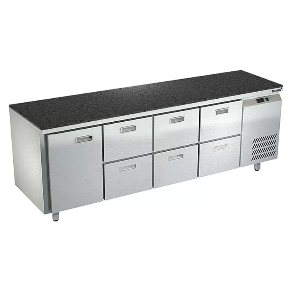 Морозильный стол Техно-ТТ СПБ/М-322/16-2206 предназначен для раскатки теста, обработки, заморозки и долговременного хранения продуктов, полуфабрикатов, напитков и мороженого на предприятиях общественного питания и торговли. Модель оснащена 1 секцией с дверью и регулируемой полкой-решеткой, 3 секциями с 6 ящиками, направляющими с доводчиками (Австрия), петлями-доводчиками (Польша) и круглыми ножками, регулируемыми по высоте на 50 мм (Италия). Корпус выполнен из нержавеющей стали AISI 430, задняя стенка и дно - из оцинкованной стали, столешница - из камня.