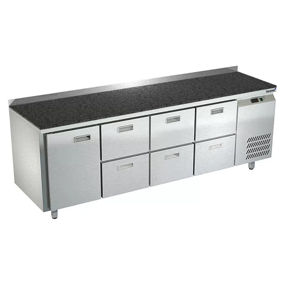 Морозильный стол Техно-ТТ СПБ/М-422/16-2206 предназначен для раскатки теста, обработки, заморозки и долговременного хранения продуктов, полуфабрикатов, напитков и мороженого на предприятиях общественного питания и торговли. Модель оснащена 1 секцией с дверью и регулируемой полкой, 3 секциями с 6 ящиками, направляющими с доводчиками (Австрия), петлями-доводчиками (Польша), бортом и круглыми ножками, регулируемыми по высоте на 50 мм (Италия). Корпус выполнен из нержавеющей стали AISI 430, задняя стенка и дно - из оцинкованной стали, столешница - из камня.