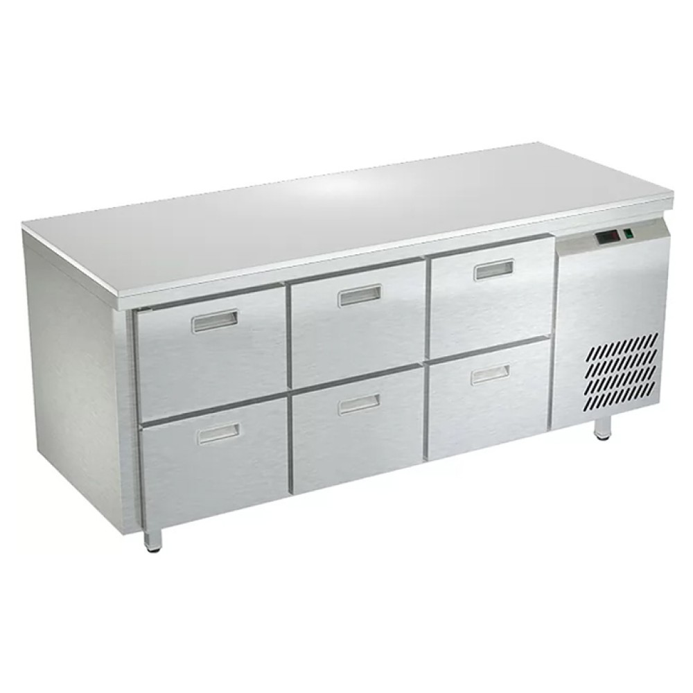 Морозильный стол Техно-ТТ СПБ/М-523/06-1806 предназначен для раскатки теста, обработки, заморозки и долговременного хранения продуктов, полуфабрикатов, напитков и мороженого на предприятиях общественного питания и торговли. Модель оснащена 3 секциями с 6 ящиками, направляющими с доводчиками (Австрия) и круглыми ножками, регулируемыми по высоте на 50 мм (Италия). Корпус выполнен из нержавеющей стали AISI 430, задняя стенка и дно - из оцинкованной стали, столешница - из полипропилена.