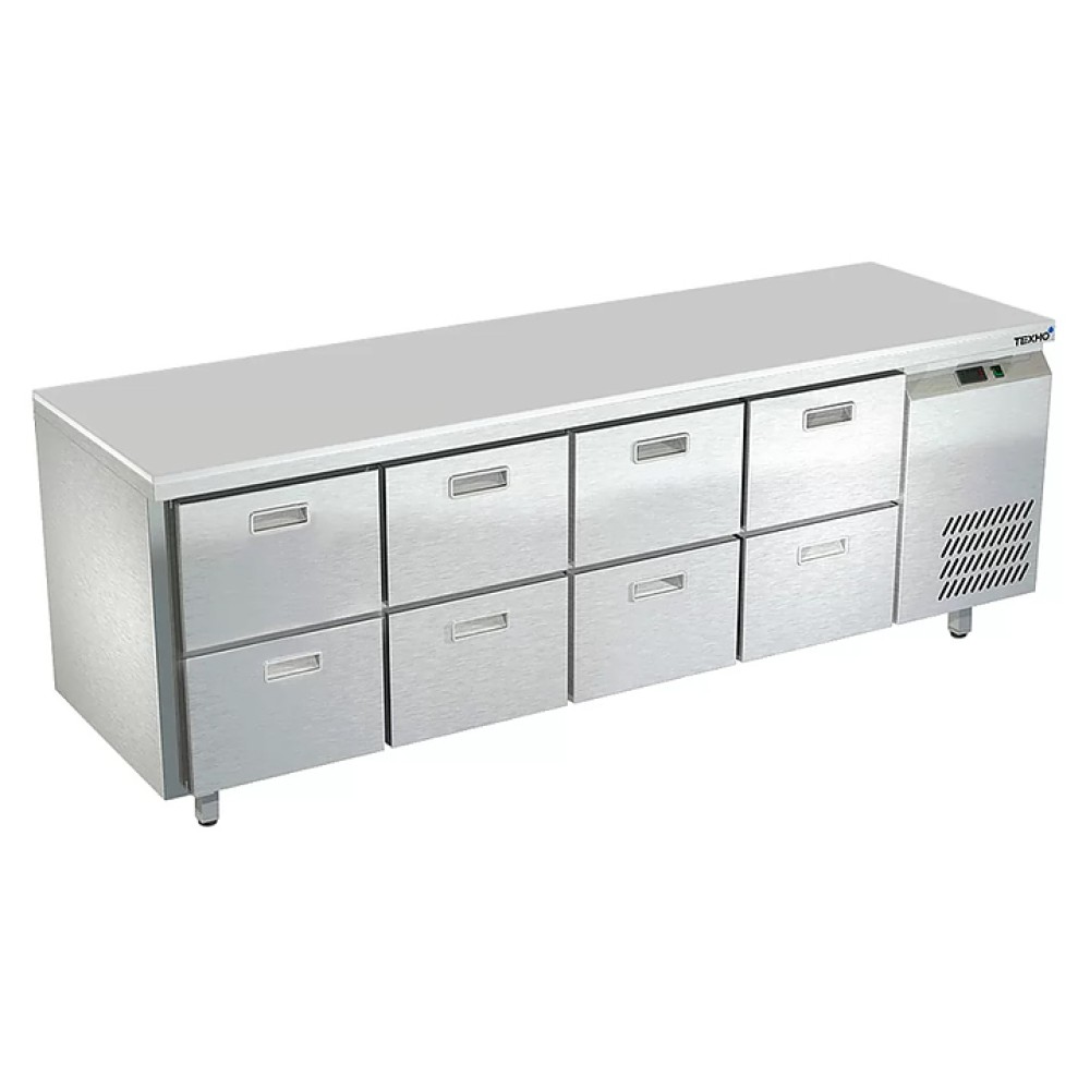 Морозильный стол Техно-ТТ СПБ/М-523/08-2206 предназначен для раскатки теста, обработки, заморозки и долговременного хранения продуктов, полуфабрикатов, напитков и мороженого на предприятиях общественного питания и торговли. Модель оснащена 4 секциями с 8 ящиками, направляющими с доводчиками (Австрия) и круглыми ножками, регулируемыми по высоте на 50 мм (Италия). Корпус выполнен из нержавеющей стали AISI 430, задняя стенка и дно - из оцинкованной стали, столешница - из полипропилена.