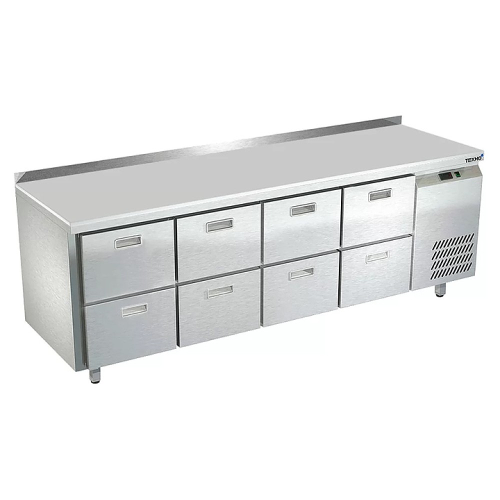 Морозильный стол Техно-ТТ СПБ/М-622/19-2207 предназначен для раскатки теста, обработки, заморозки и долговременного хранения продуктов, полуфабрикатов, напитков и мороженого на предприятиях общественного питания и торговли. Модель оснащена 4 секциями с 8 ящиками, направляющими с доводчиками (Австрия), бортом и круглыми ножками, регулируемыми по высоте на 50 мм (Италия). Корпус выполнен из нержавеющей стали AISI 430, задняя стенка и дно - из оцинкованной стали, столешница - из полипропилена.