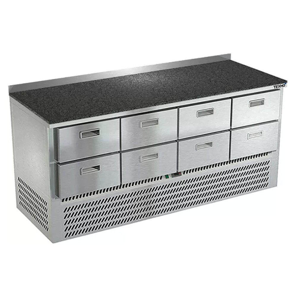 Морозильный стол Техно-ТТ СПН/М-423/08-1906 предназначен для раскатки теста, обработки, заморозки и долговременного хранения продуктов, полуфабрикатов, напитков и мороженого на предприятиях общественного питания и торговли. Модель оснащена компрессором, произведенным в Испании, 8 гастронормированными ящиками, направляющими с доводчиками (Австрия) и регулируемыми опорными ножками. Корпус выполнен из нержавеющей стали AISI 430, задняя стенка и дно - из оцинкованной стали, столешница - каменная.