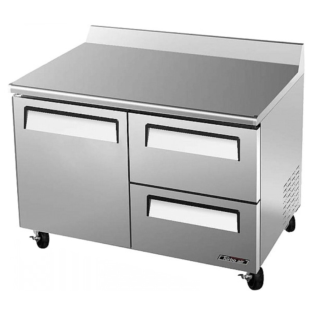 Морозильный стол Turbo air CMWF-48-2D-2 предназначен для обработки, охлаждения, заморозки и длительного хранения пищевых продуктов на предприятиях общественного питания и торговли. Модель оснащена дверцей, полкой, 2 ящиками, эргономичными ручками и 4 колесами. Корпус выполнен из нержавеющей стали (гальванизированная сталь на оборотной стороне и внизу), пол - из нержавеющей стали с алюминиевыми вставками по бокам и сзади, тройные направляющие ящиков и дверные петли - из нержавеющей стали, полка - из толстой стальной проволоки с виниловым покрытием.