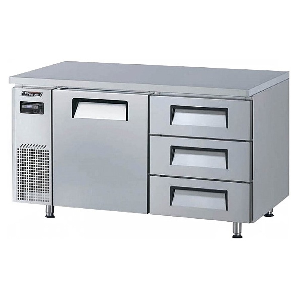 Морозильный стол Turbo air KUF15-3D-3-700 предназначен для обработки, охлаждения, заморозки и длительного хранения пищевых продуктов на предприятиях общественного питания и торговли. Модель оснащена дверью, полкой, 3 ящиками, эргономичными ручками и 4 регулируемыми ножками. Корпус выполнен из нержавеющей стали (гальванизированная сталь на оборотной стороне и внизу), пол - из нержавеющей стали с алюминиевыми вставками по бокам и сзади, тройные направляющие ящиков и ножки - из нержавеющей стали, уплотнение - из ABS-пластика.