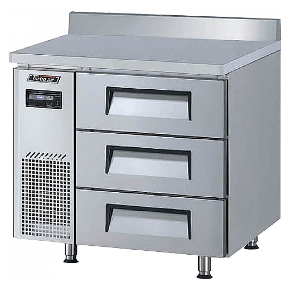 Морозильный стол Turbo air KWF9-3D-3-600 предназначен для обработки, охлаждения, заморозки и длительного хранения пищевых продуктов на предприятиях общественного питания и торговли. Модель оснащена 3 ящиками и 4 регулируемыми ножками. Корпус выполнен из нержавеющей стали (гальванизированная сталь на оборотной стороне и внизу), пол - из нержавеющей стали с алюминиевыми вставками по бокам и сзади, тройные направляющие и ножки - из высококачественной нержавеющей стали, уплотнение - из ABS-пластика.