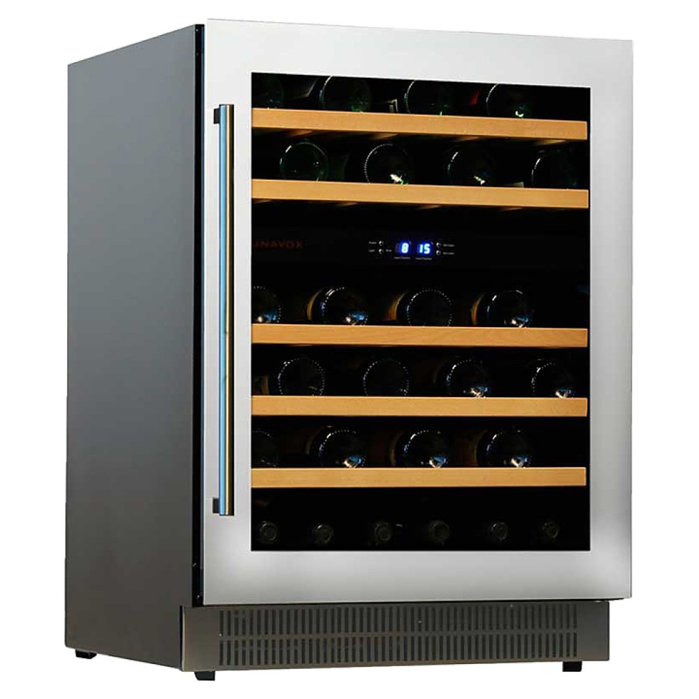Винный шкаф Dunavox DAU-46.146DW предназначен для демонстрации, хранения и создания оптимальных условий для сохранения всех вкусовых свойств вина в бутылках на предприятиях общественного питания, торговли, в барах, ресторанах, специализированных магазинах, частных домах или квартирах. Модель оснащена цифровым дисплеем, электронной панелью управления и LED-подсветкой синего цвета в каждой зоне. Корпус выполнен из окрашенного металла, дверь - из полированной стальной рамы белого цвета и тонированного стекла с защитой от ультрафиолетовых лучей, полки - из дерева без лакового покрытия, накладная ручка двери - из нержавеющей стали.