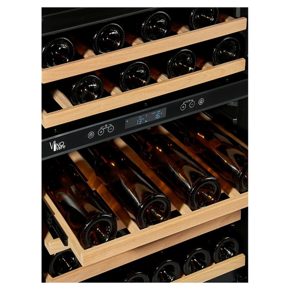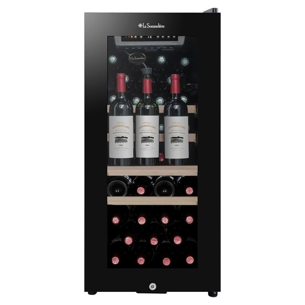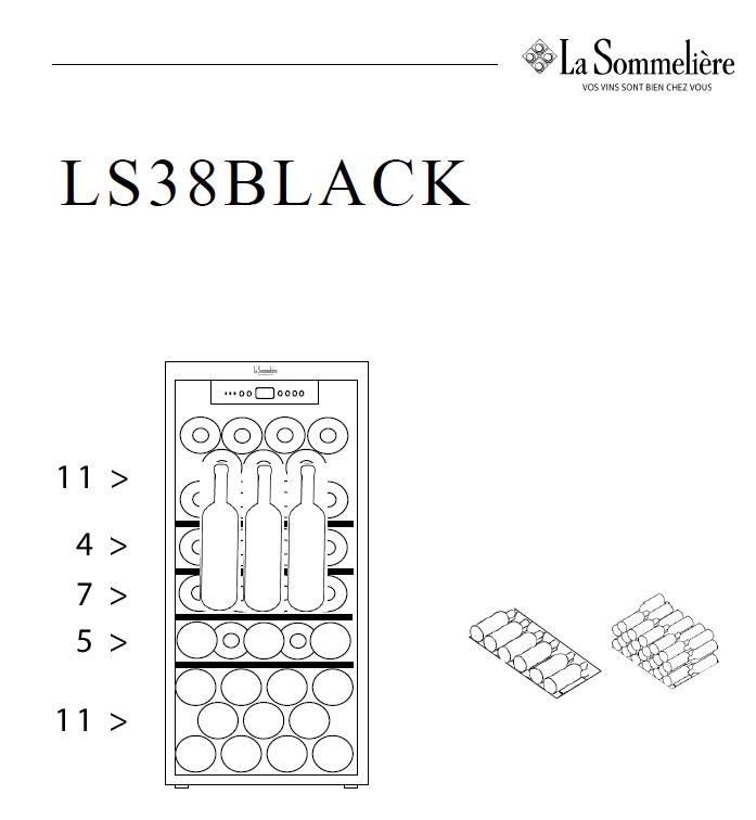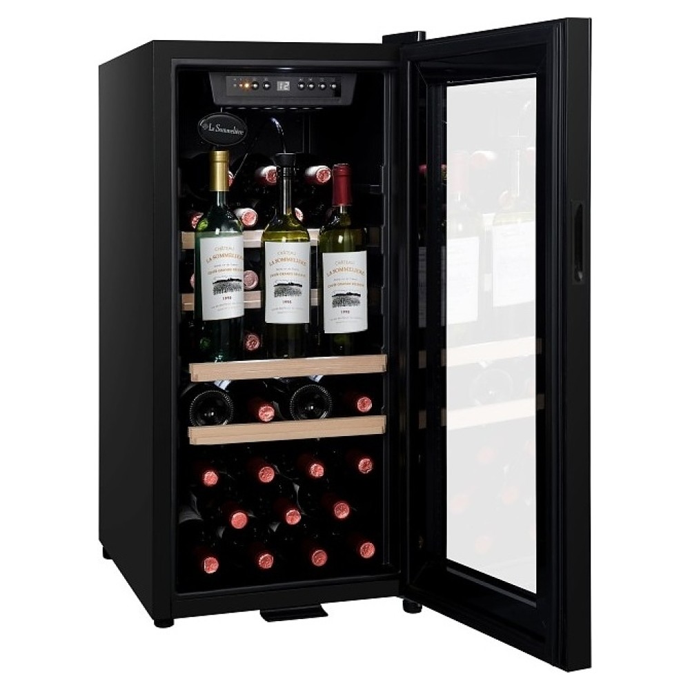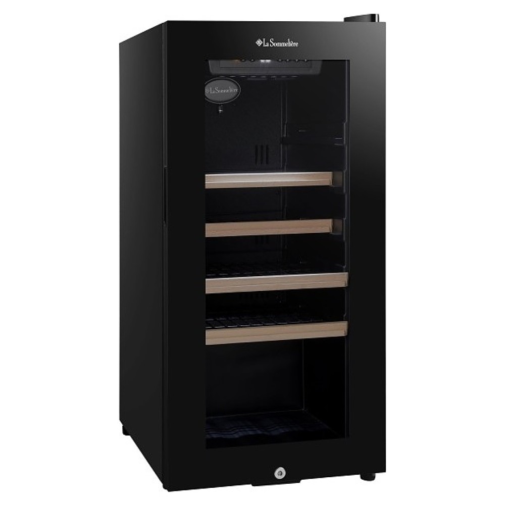 Винный шкаф La Sommeliere LS38BLACK предназначен для хранения при оптимальных условиях и демонстрации бутилированного вина различных сортов в барах, ресторанах, специализированных магазинах, складских помещениях, а также домашних условиях. Модель оснащена холодильной камерой с правосторонней распашной дверью на внешних петлях, обзорным остеклением, кабелем питания с вилкой, расположенной внутри камеры панелью управления с сенсорными клавишами, светодиодными лампами и цифровым дисплеем индикации. Корпус и рама двери выполнены из металла с антикоррозийным покрытием черного цвета, внутренняя облицовка камеры черного цвета, полки – из стали с фронтом из массива буковой древесины.