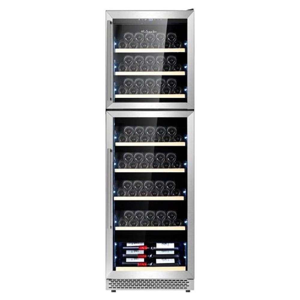 Винный шкаф La Sommeliere MT166DP предназначен для хранения бутилированного вина в ресторанах, специализированных магазинах, подсобных складских помещениях, в частных домах или квартирах. Модель оснащена 2 независимыми температурными отсеками, сенсорным цифровым дисплеем, подсветкой, 8 полками, 2 замками и 4 регулируемыми ножками. Двери выполнены из стеклопакета с УФ защитой, полки - из дерева с фасадом из нержавеющей стали.