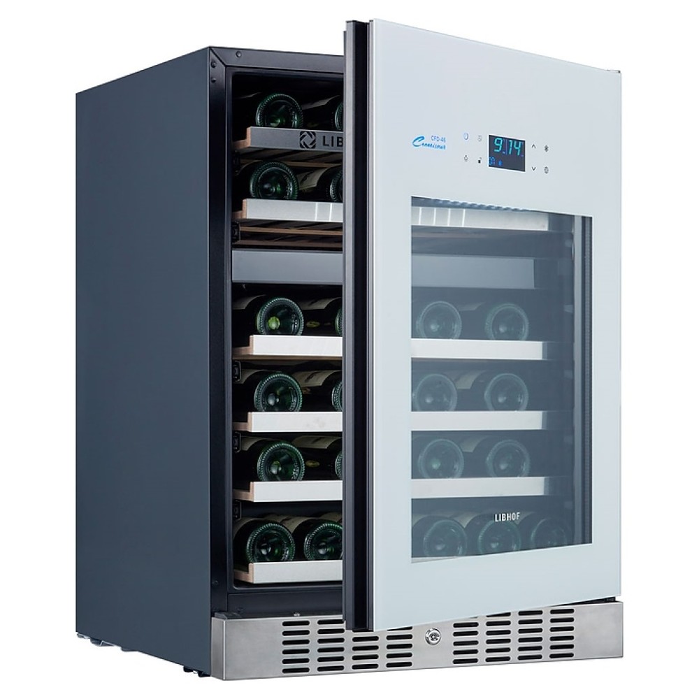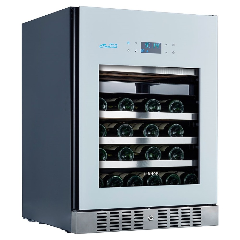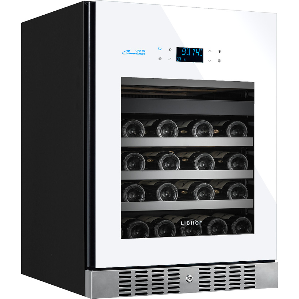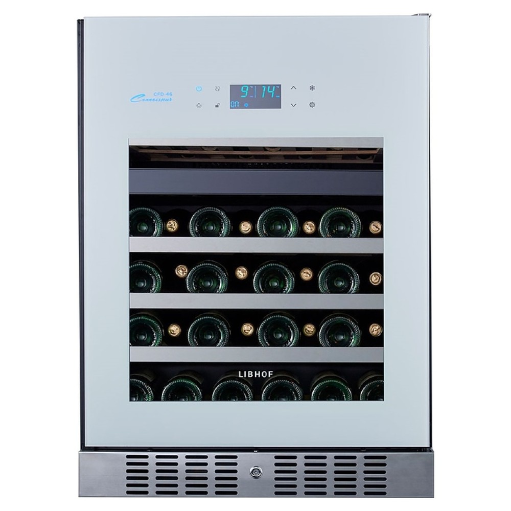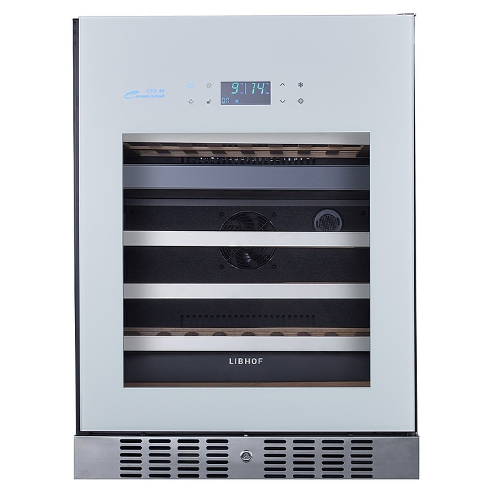 Встраиваемый винный шкаф Libhof Connoisseur CFD-46 White предназначен для хранения при оптимальных условиях бутилированного вина различных сортов в барах, ресторанах, специализированных магазинах, подсобных складских помещениях, а также домашних условиях. Модель оснащена холодильной камерой с 2 независимыми температурными зонами, съемной цокольной вентиляционной решеткой, запираемой на ключ распашной дверью на внешних петлях, интегрированной рукояткой, прозрачным обзорным остеклением, внешней сенсорной панелью управления и цифровым дисплеем. Корпус выполнен из металла с антикоррозийным покрытием черного цвета, полки – из массива буковой древесины с хромированной окантовкой фасада, фронт двери белого цвета.