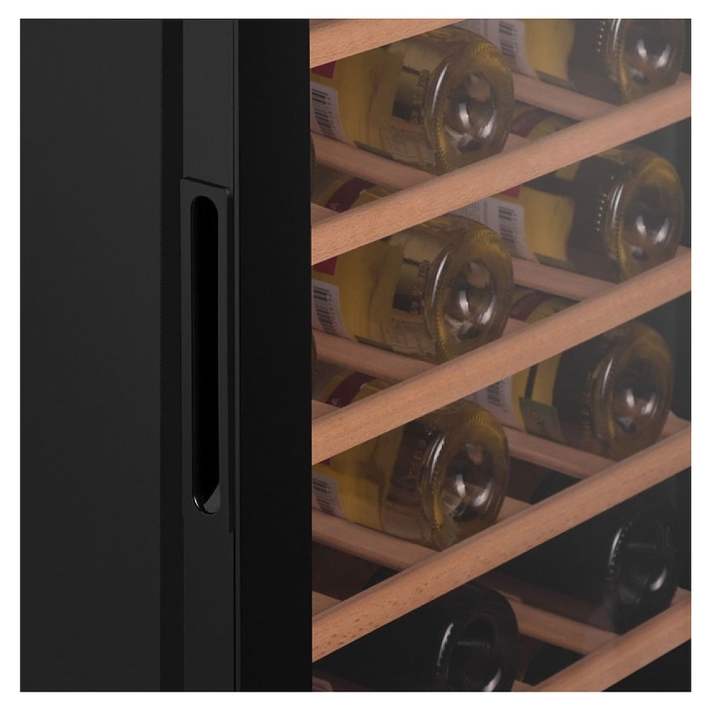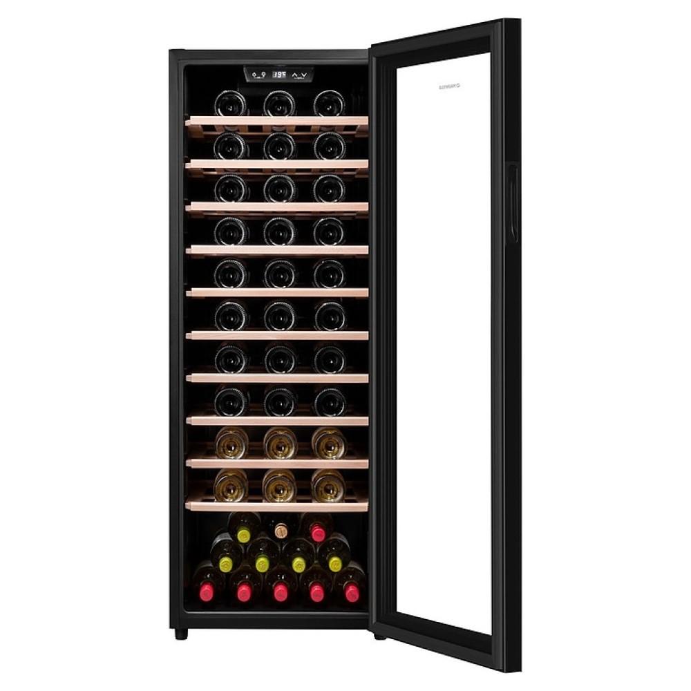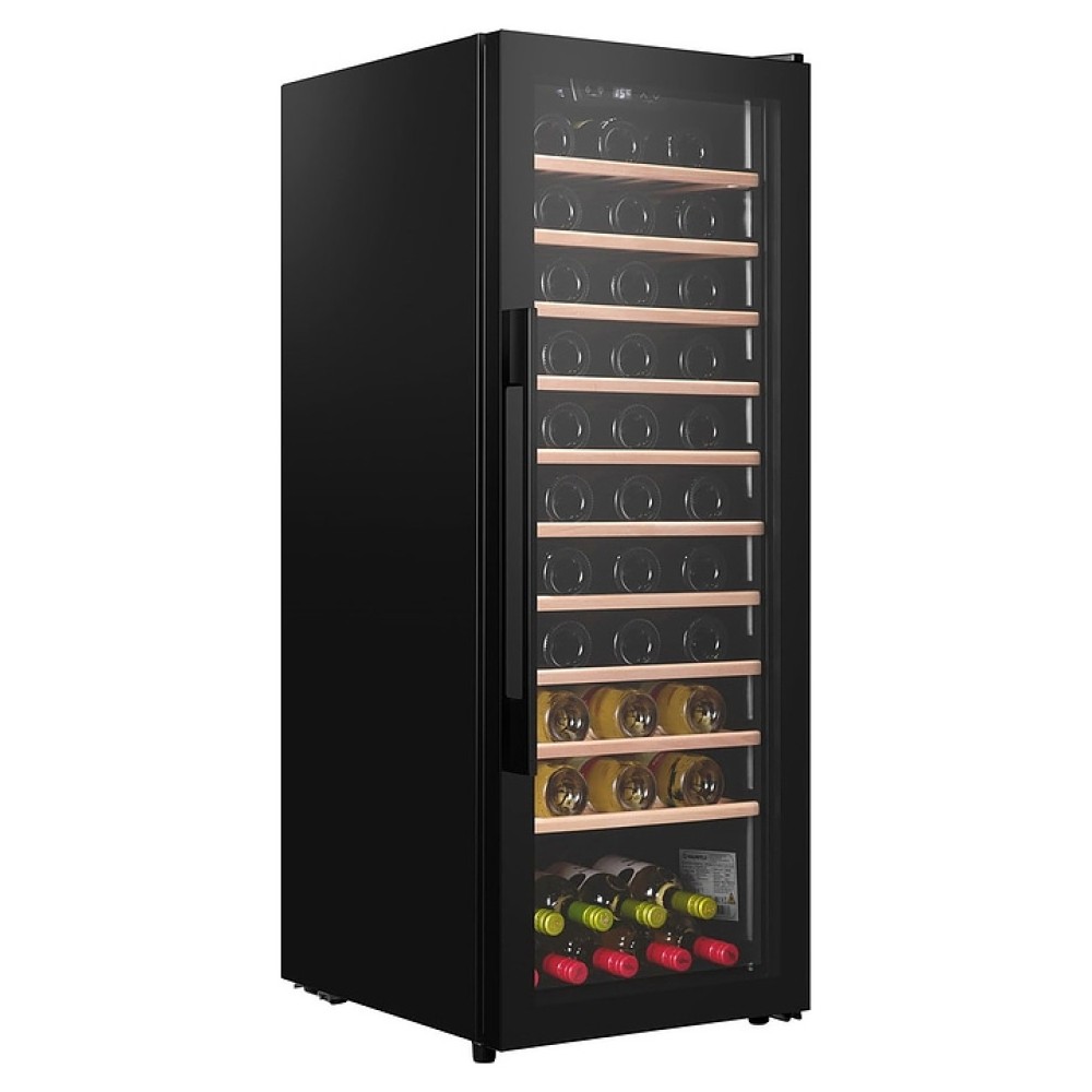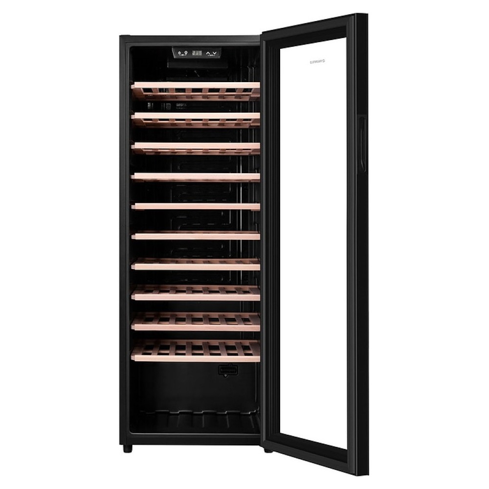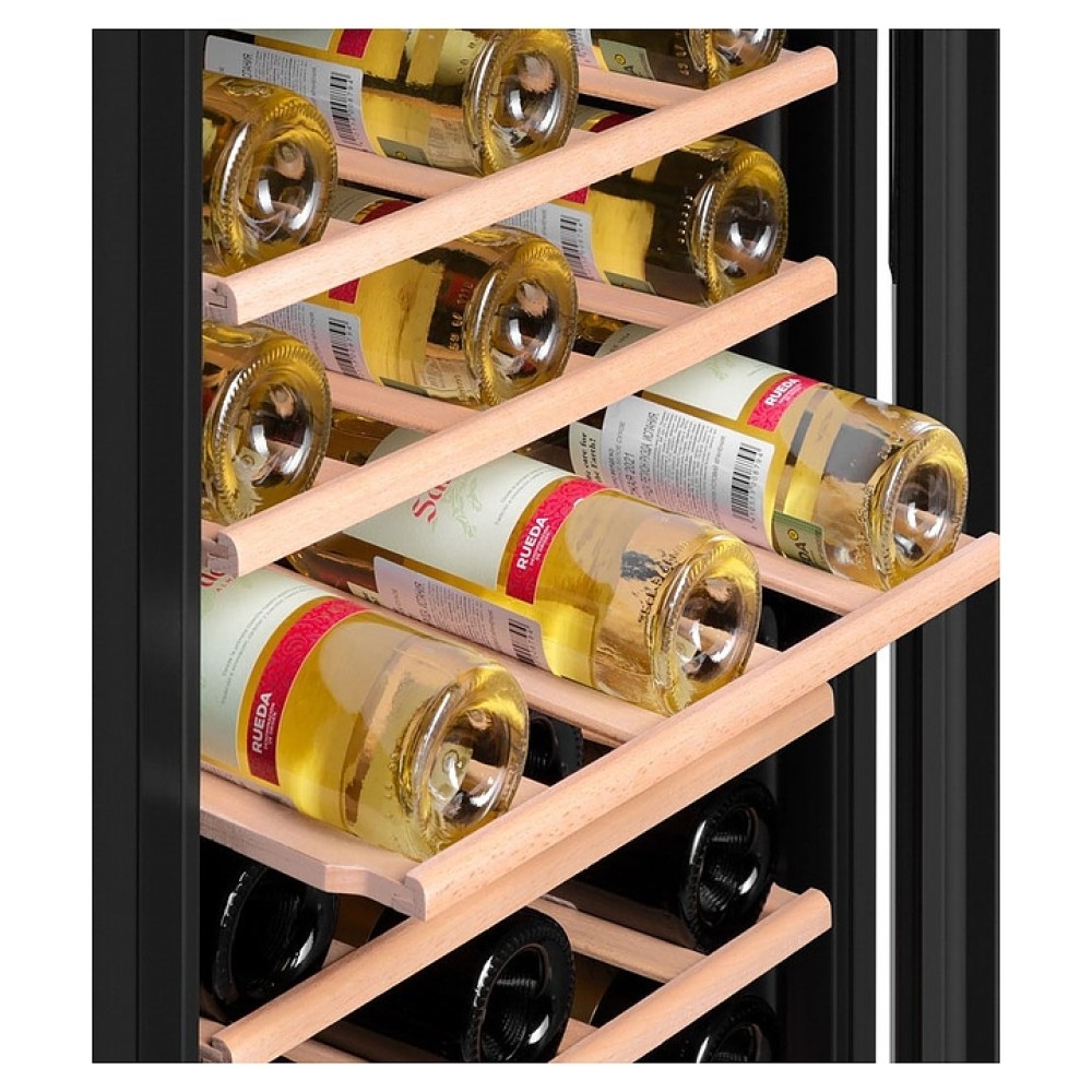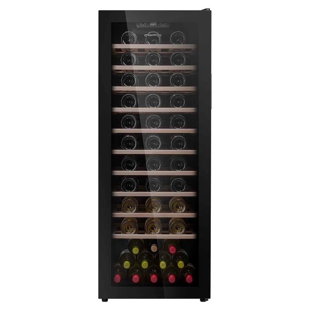 Винный шкаф Maunfeld MFWC-201S84 предназначен для хранения при оптимальных условиях и предпродажной демонстрации бутилированного вина различных сортов в барах, ресторанах, специализированных магазинах, подсобных складских помещениях, а также домашних условиях. Модель оснащена холодильной камерой с правосторонней распашной дверью на перенавешиваемых петлях с обзорным остеклением, кабелем питания, расположенной внутри камеры электронной панелью управления с сенсорными функциональными клавишами и цифровым светодиодным дисплеем с белой подсветкой индикации. Корпус выполнен из металла с матовым антикоррозийным покрытием черного цвета, дверь с полным фронтальным остеклением без винтового крепежа из прозрачного тонированного стекла, внутренняя облицовка камеры черного цвета, полки – из массива буковой древесины.