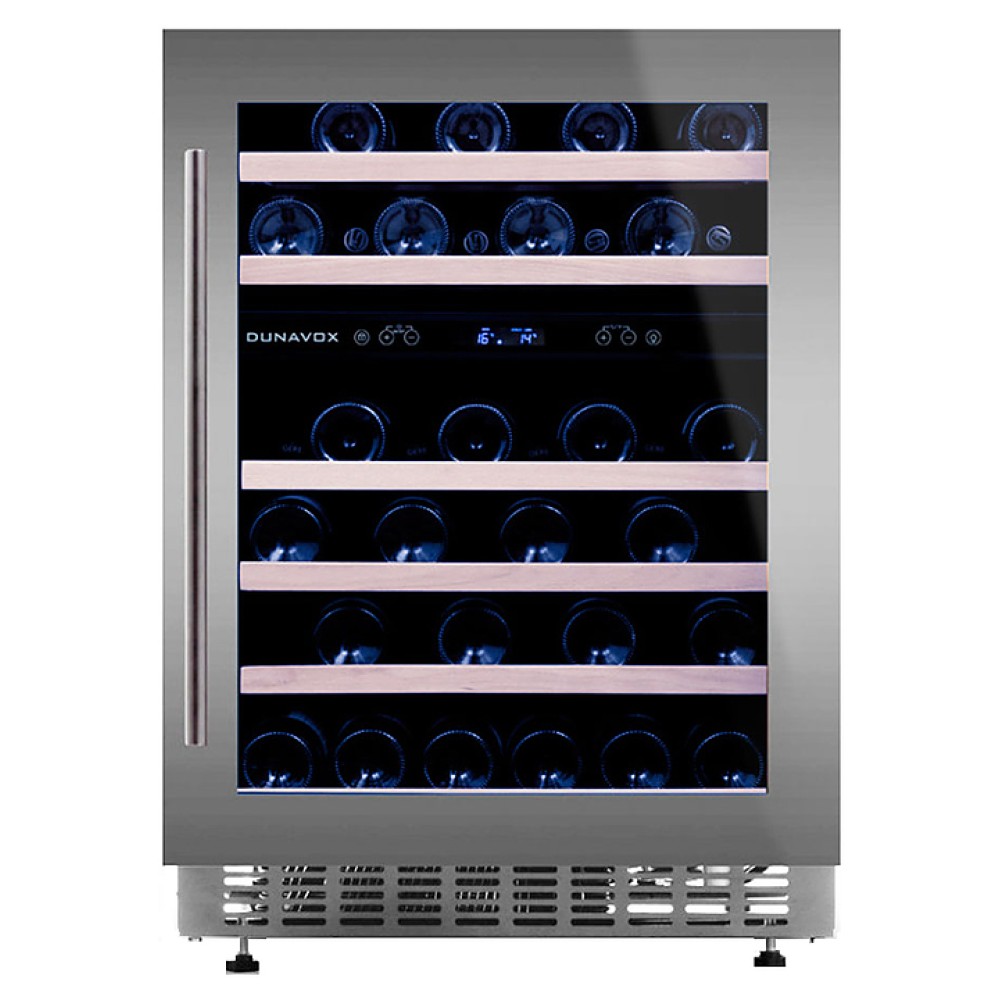 Винный шкаф Dunavox DAU-46.145DSS предназначен для демонстрации, хранения и создания оптимальных условий для сохранения всех вкусовых свойств вина в бутылках на предприятиях общественного питания, торговли, в барах, ресторанах, специализированных магазинах, частных домах или квартирах. Модель оснащена сенсорной панелью управления и LED-подсветкой синего цвета в каждой зоне. Корпус выполнен из окрашенной в черный цвет стали, дверь - из бесшовной стальной рамы и тонированного стекла с защитой от ультрафиолетовых лучей, полки - из нелакированного бука, накладная ручка двери - из нержавеющей стали.