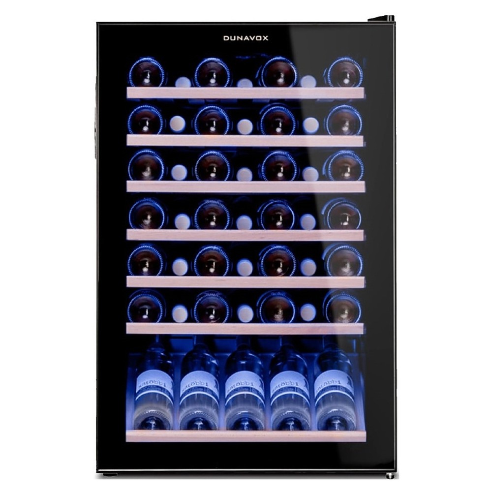 Винный шкаф Dunavox DX-48.130KF предназначен для демонстрации, хранения и создания оптимальных условий для сохранения всех вкусовых свойств вина в бутылках на предприятиях общественного питания, торговли, в барах, ресторанах, специализированных магазинах, частных домах или квартирах. Модель оснащена сенсорной панелью управления и LED-подсветкой синего цвета. Дверь выполнена из рамы черного цвета и тонированного стекла с защитой от ультрафиолетовых лучей, полки - из нелакированного бука, демонстрационная решетка - из хромированного металла.