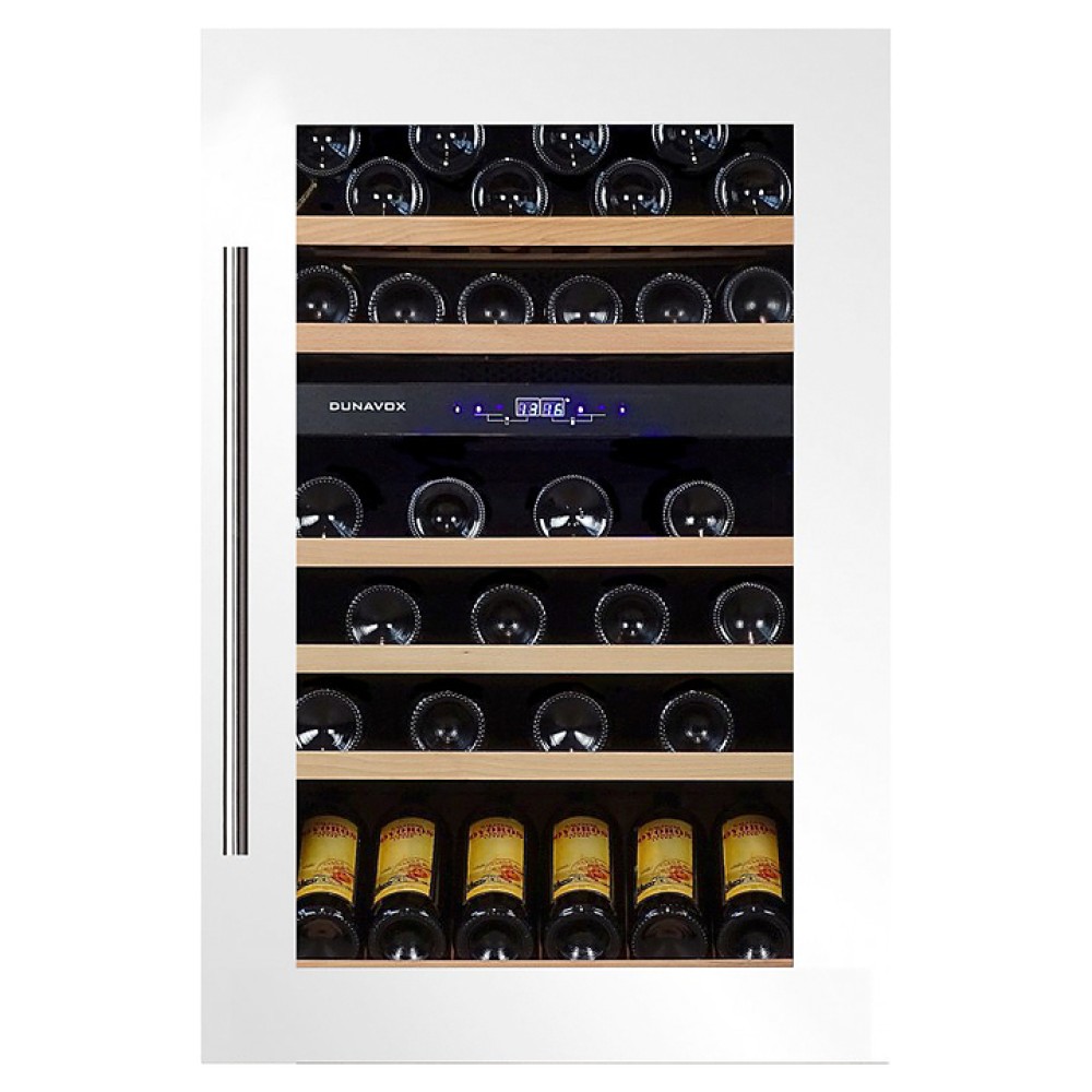 Винный шкаф Dunavox DX-57.146DWK серии Built-in предназначен для демонстрации, хранения и создания оптимальных условий для сохранения всех вкусовых свойств вина в бутылках на предприятиях общественного питания, торговли, в барах, ресторанах, специализированных магазинах, частных домах или квартирах. Модель оснащена сенсорной панелью управления и LED-подсветкой синего цвета в каждой зоне. Корпус выполнен из окрашенного металла, дверь - из рамы белого цвета и тонированного стекла с защитой от ультрафиолетовых лучей, полки - из нелакированного бука, накладная ручка двери - из нержавеющей стали.