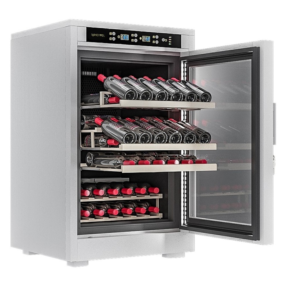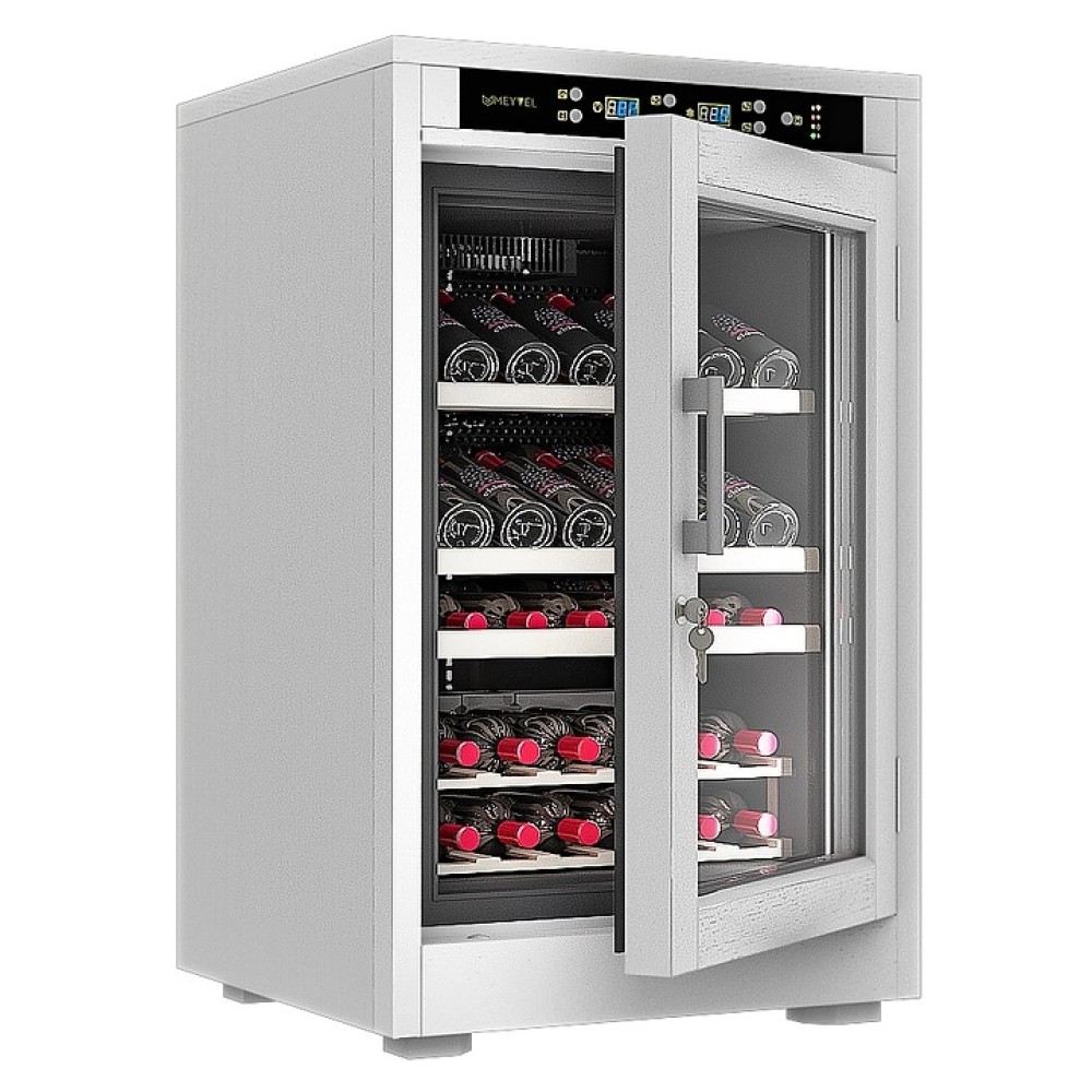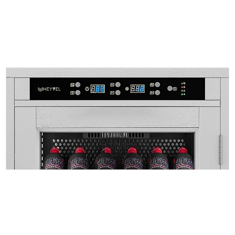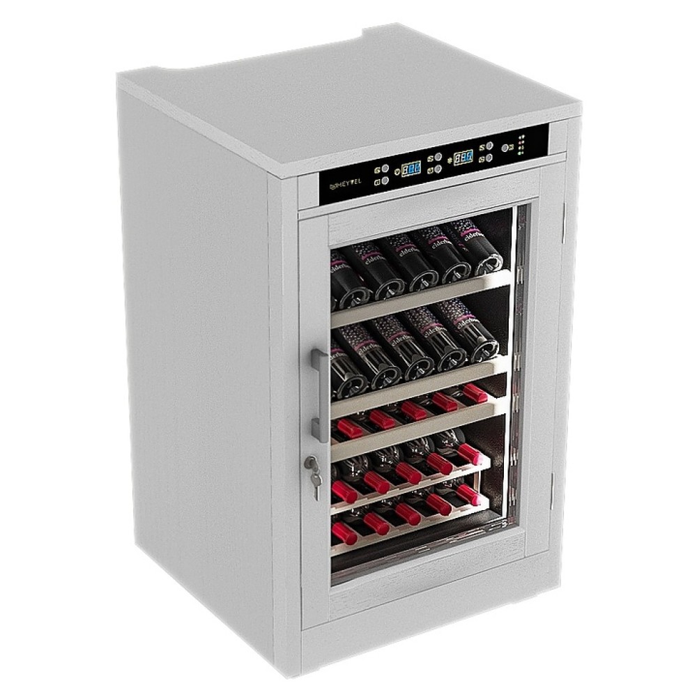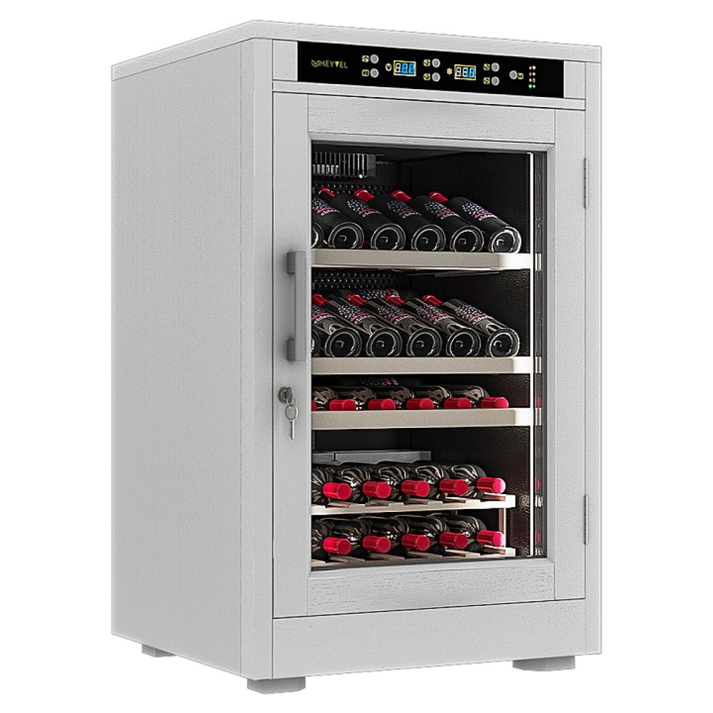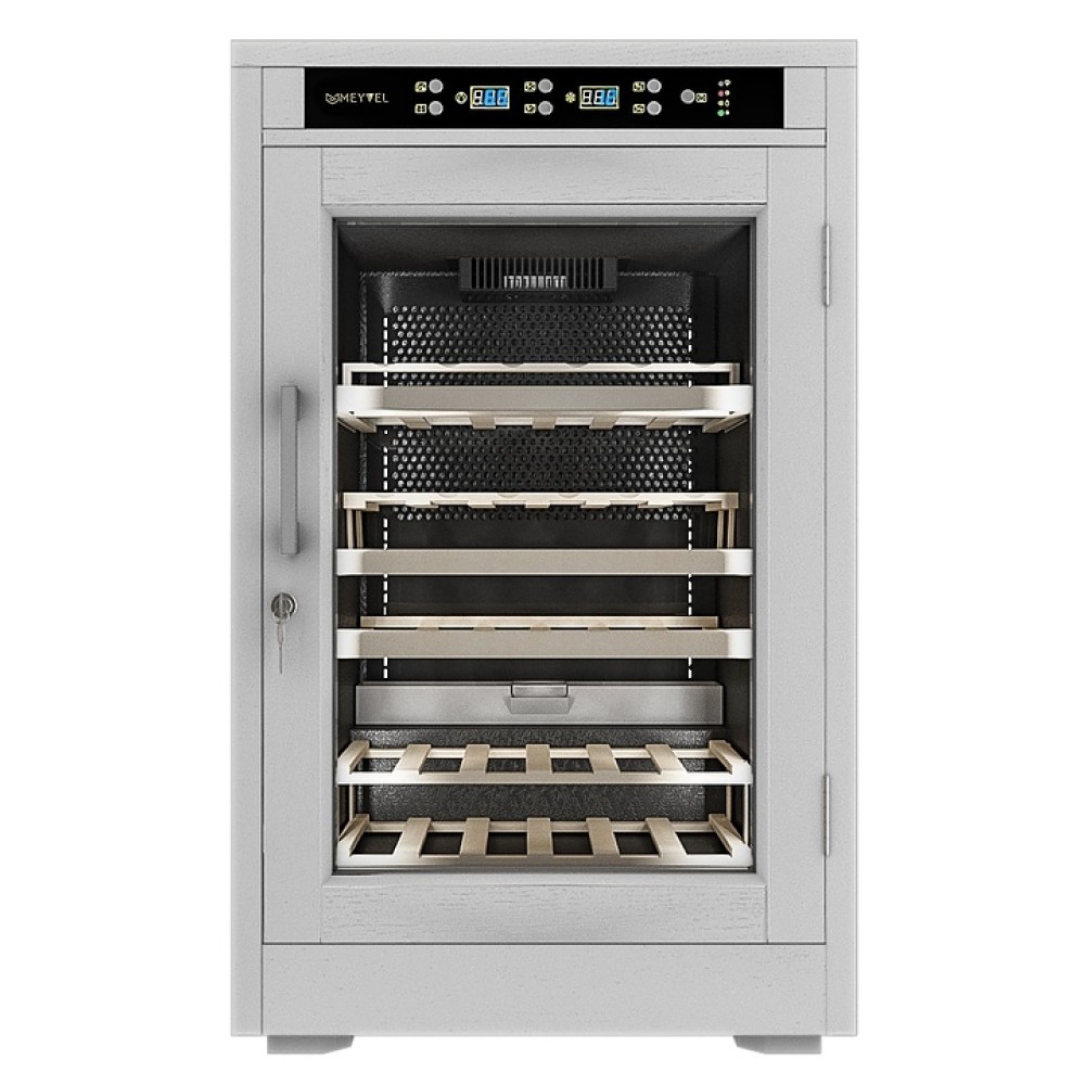 Винный шкаф MEYVEL MV46-WW1-M предназначен для демонстрации, хранения и создания оптимальных условий для сохранения всех вкусовых свойств вина в бутылках на предприятиях общественного питания, торговли, в барах, ресторанах, специализированных магазинах, частных домах или квартирах. Модель оснащена сенсорной панелью управления, электронным термостатом и светодиодной подсветкой. Корпус выполнен из обшитой деревом стали, дверь - из деревянной рамы и двойного стекла с защитой от ультрафиолетовых лучей, полки - из массива бука.