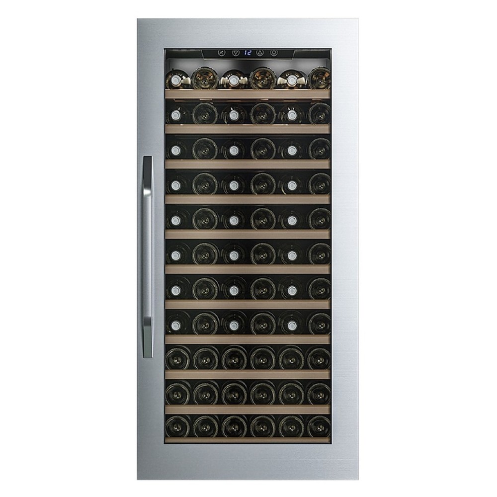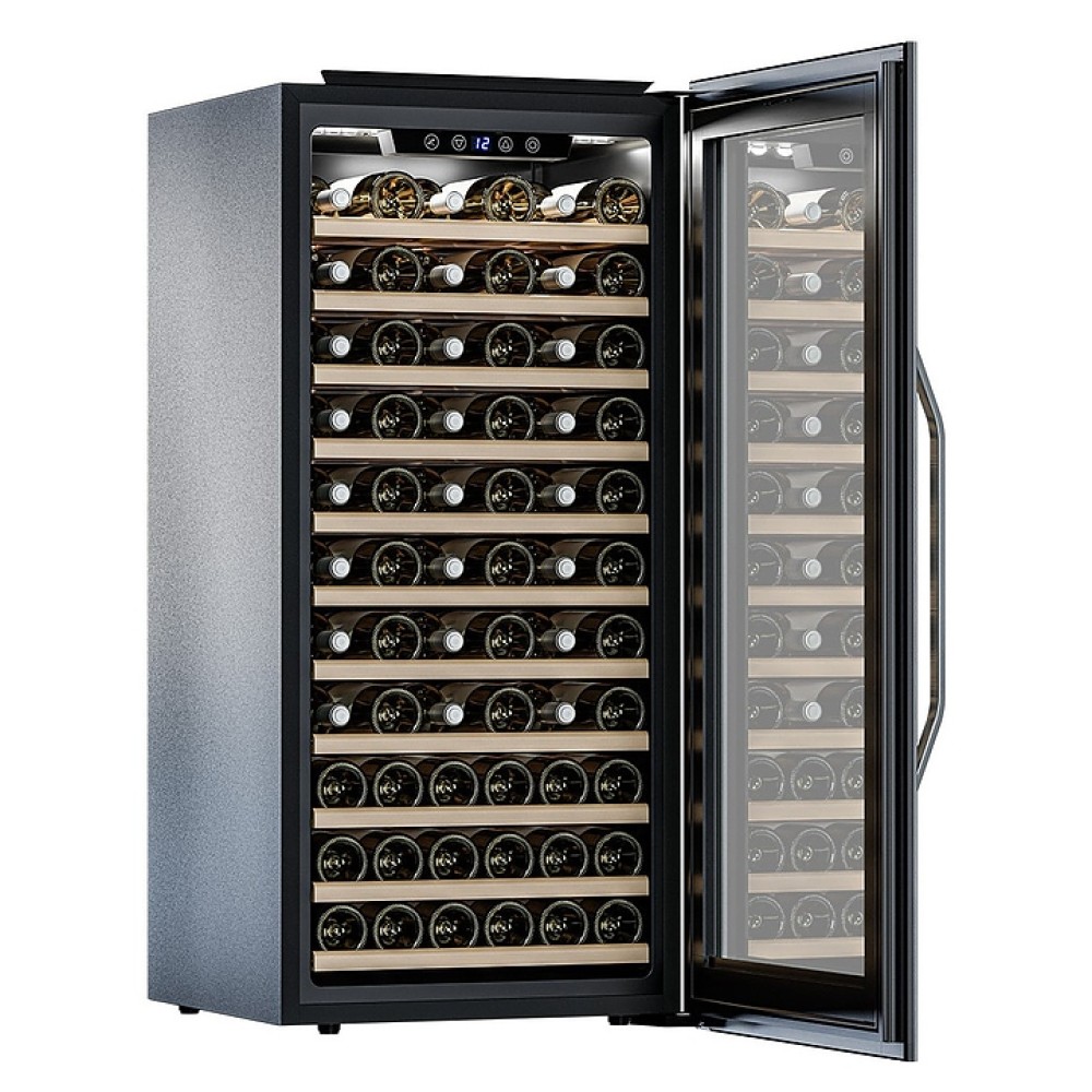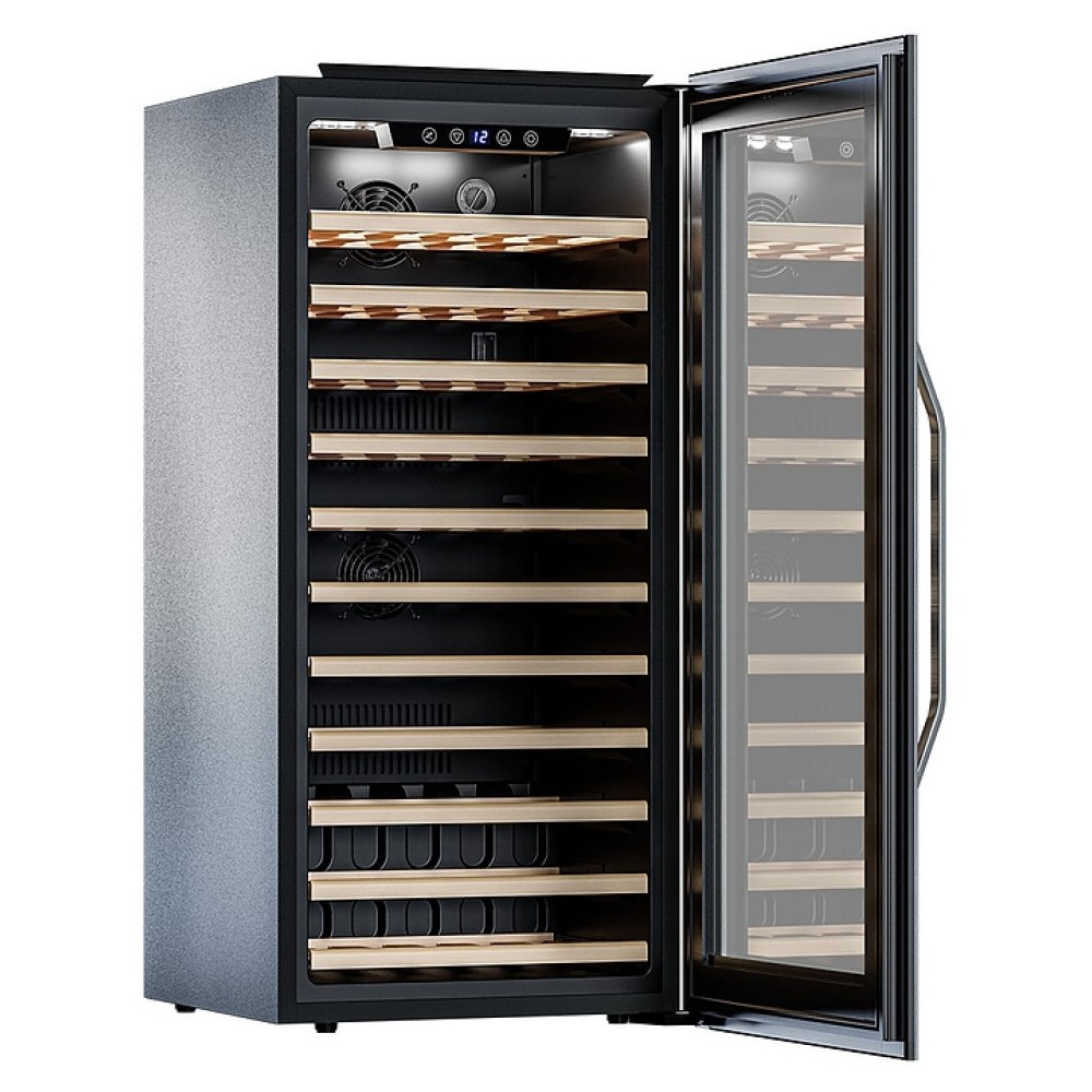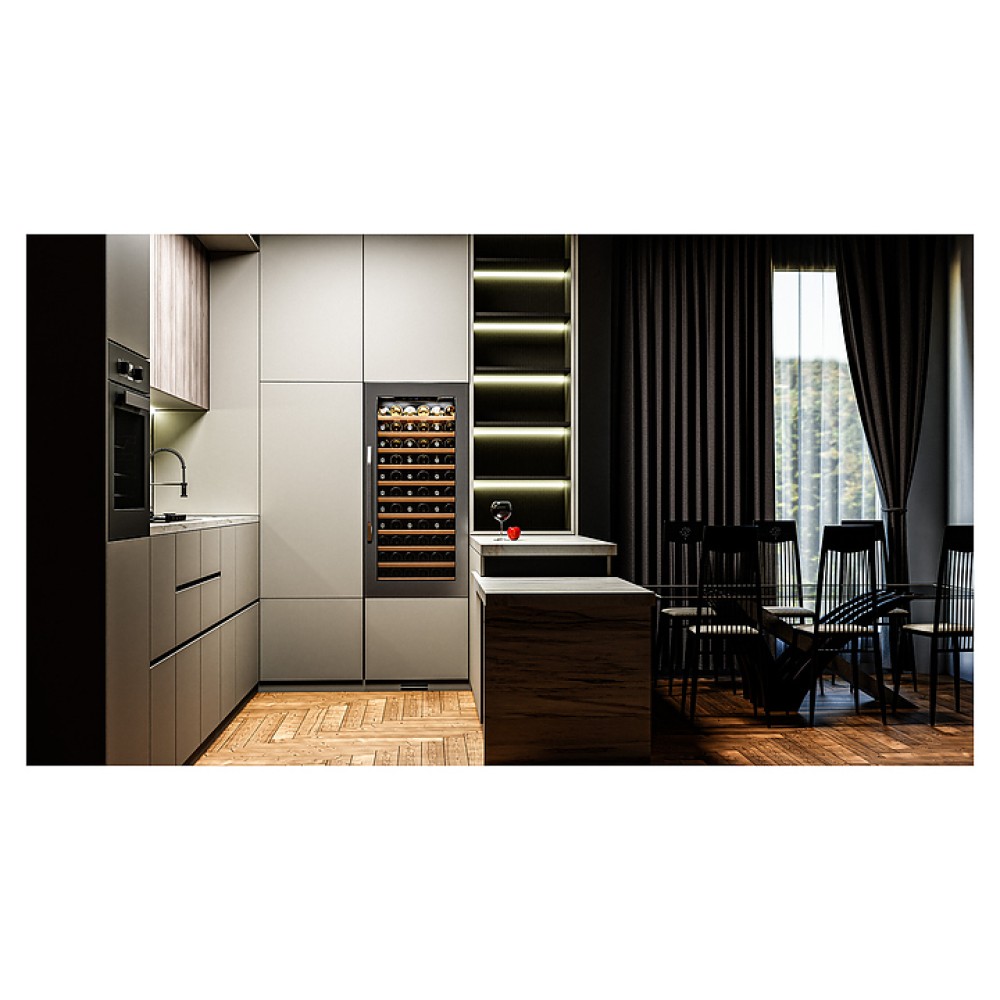 Винный шкаф MEYVEL MV66-KSB1 предназначен для демонстрации, хранения и создания оптимальных условий для сохранения всех вкусовых свойств вина в бутылках на предприятиях общественного питания, торговли, в барах, ресторанах, специализированных магазинах, частных домах или квартирах. Модель оснащена удобным электронным управлением, белым панорамным освещением, угольным фильтром и регулируемыми по высоте ножками. Корпус и дверная ручка выполнены из стали, дверь - из двойного стекла с УФ защитой со стальной окантовкой, полки - из массива бука.
