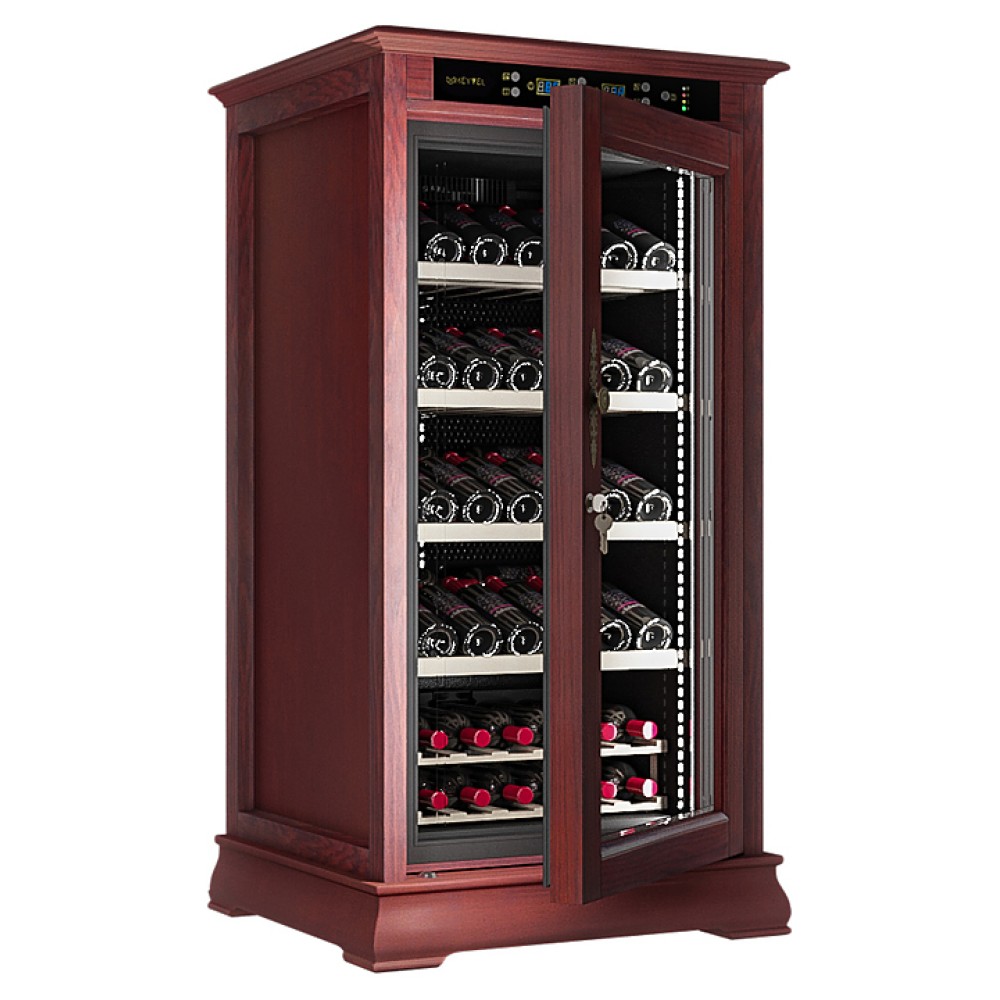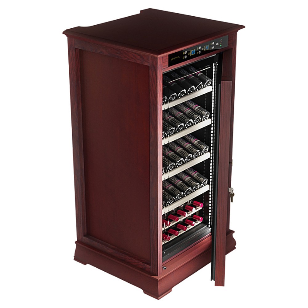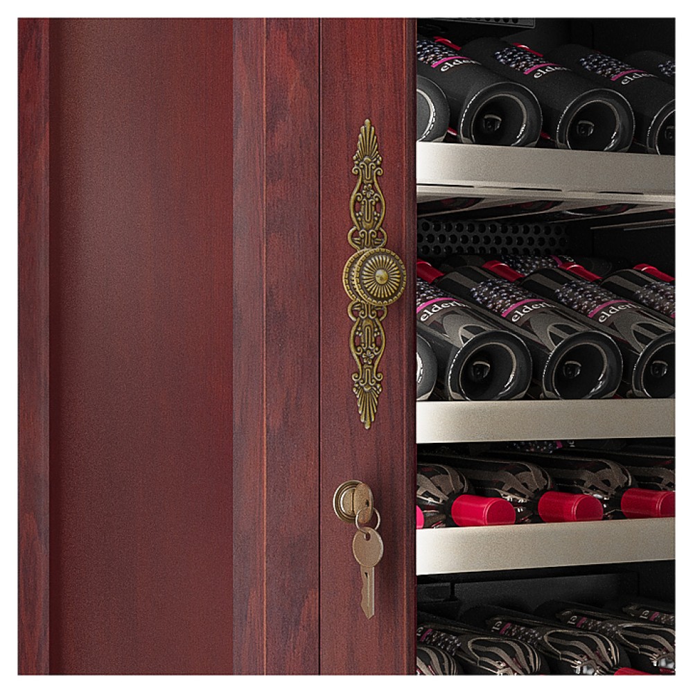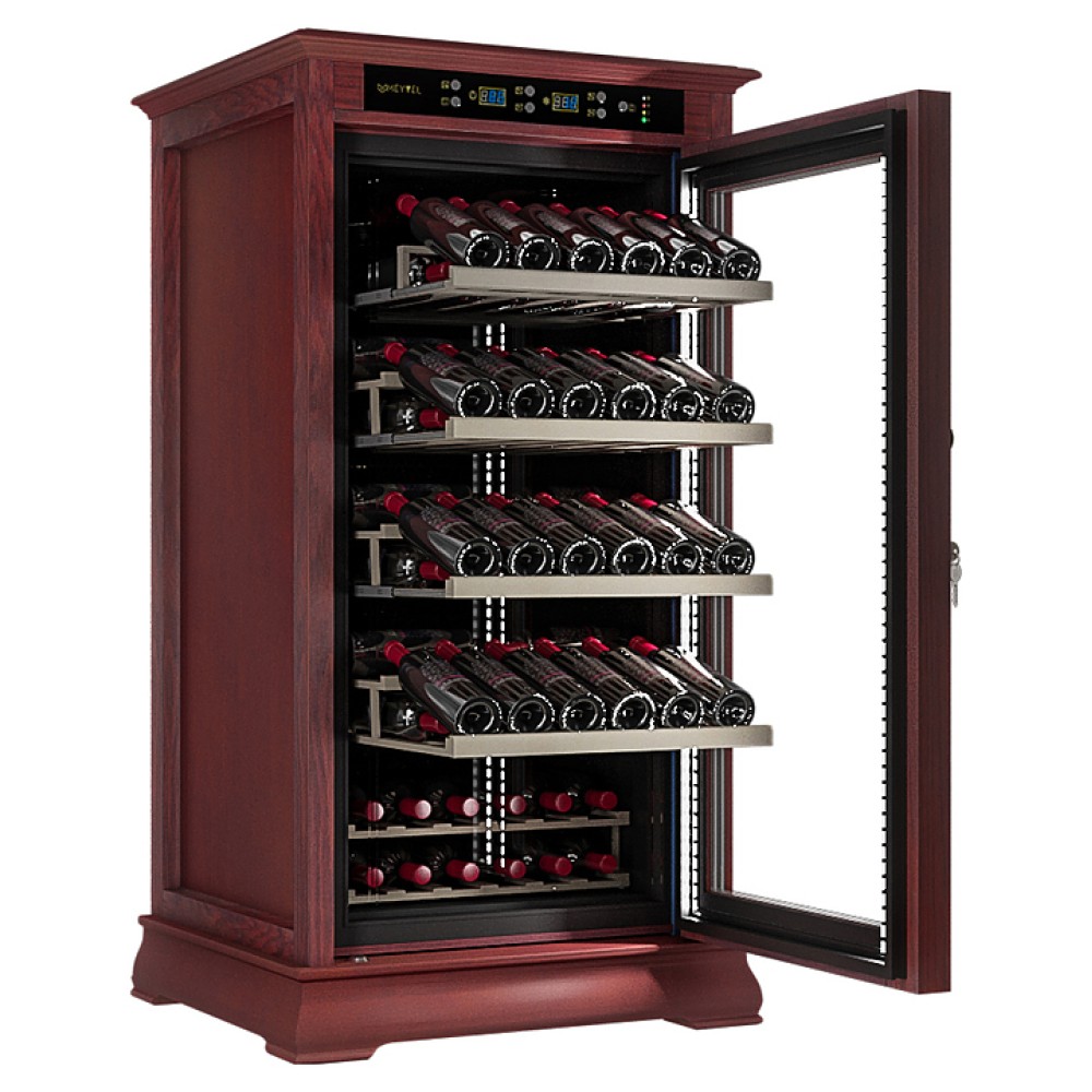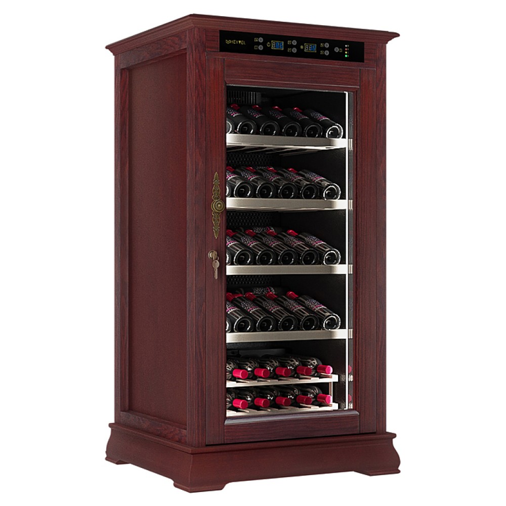 Винный шкаф MEYVEL MV66-WM1-C предназначен для демонстрации, хранения и создания оптимальных условий для сохранения всех вкусовых свойств вина в бутылках на предприятиях общественного питания, торговли, в барах, ресторанах, специализированных магазинах, частных домах или квартирах. Модель оснащена сенсорной панелью управления, электронным термостатом и светодиодной подсветкой. Корпус выполнен из обшитой красным американским дубом стали, дверь - из деревянной рамы и двойного стекла с защитой от ультрафиолетовых лучей, полки - из массива бука, ручка двери - из стали.