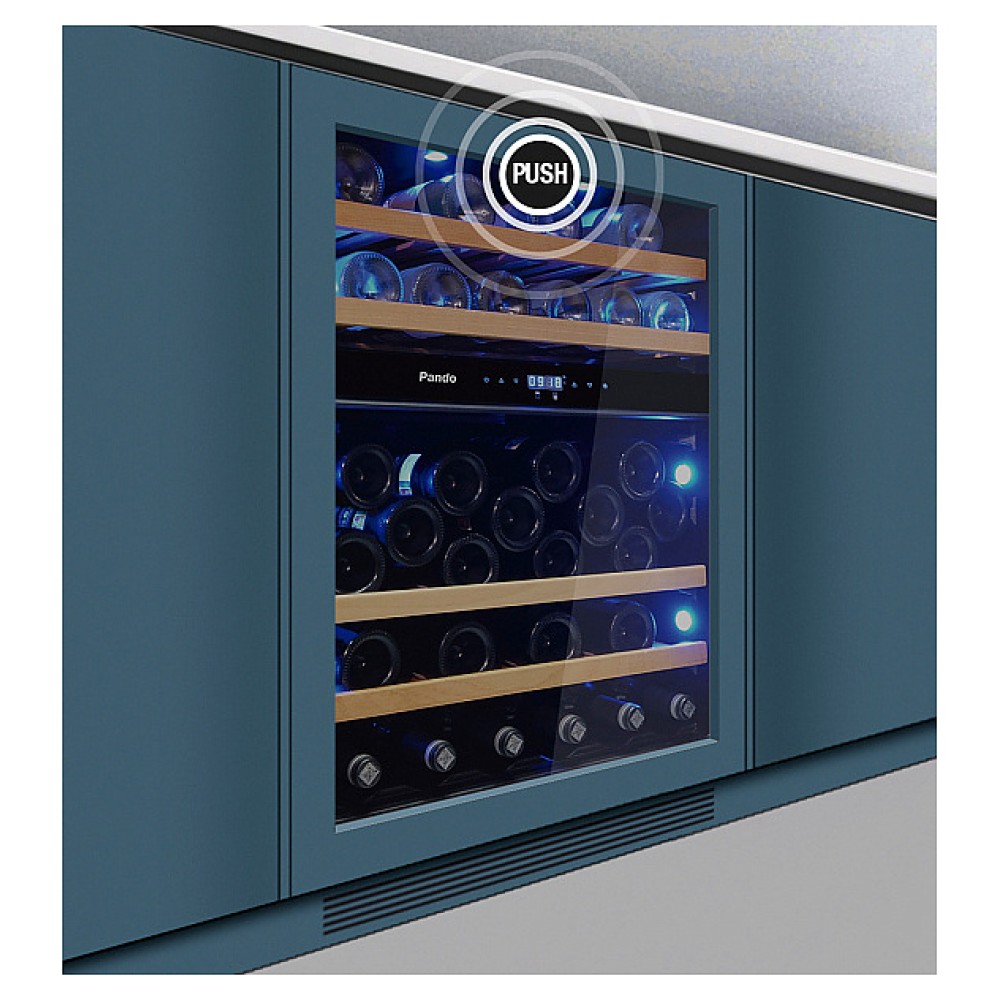 Винный шкаф Pando PVMBP 60-45 HD PAL предназначен для хранения при оптимальных условиях и предпродажной демонстрации бутилированного вина различных сортов в барах, ресторанах, специализированных магазинах, подсобных складских помещениях, а также домашних условиях. Модель оснащена холодильной камерой с 2 температурными зонами, левосторонней распашной дверью, внутренней сенсорной панелью управления и светодиодными цифровыми дисплеями с голубой подсветкой индикации. Корпус и рама двери выполнены из стали с антикоррозийным покрытием, остекление двери – из закаленного стекла с прозрачной дымчатой тонировкой, внутренняя облицовка камеры черного цвета, полки – из массива буковой древесины.