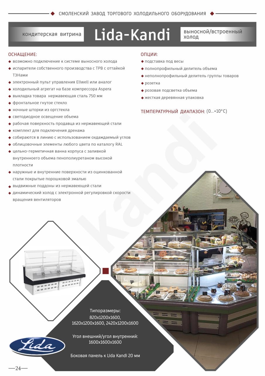 Кондитерская холодильная витрина Lida Kandi (820х1200х1600 мм) используется на предприятиях общественного питания и торговли для кратковременного хранения и предпродажной демонстрации тортов, пирожных и других кондитерских изделий. Модель оснащена подставкой с фронтальной термовыводящей решеткой и внешней полкой со стороны продавца. Наружные и внутренние поверхности выполнены из нержавеющей и оцинкованной стали с антикоррозийным покрытием порошковой эмалью, внешняя полка и выдвижные поддоны – из нержавеющей стали, ночные шторки – из оргстекла.