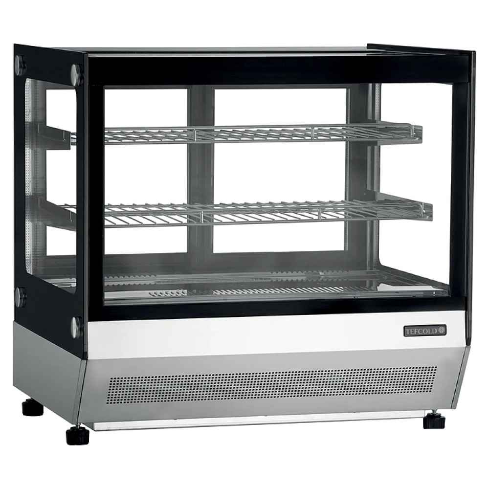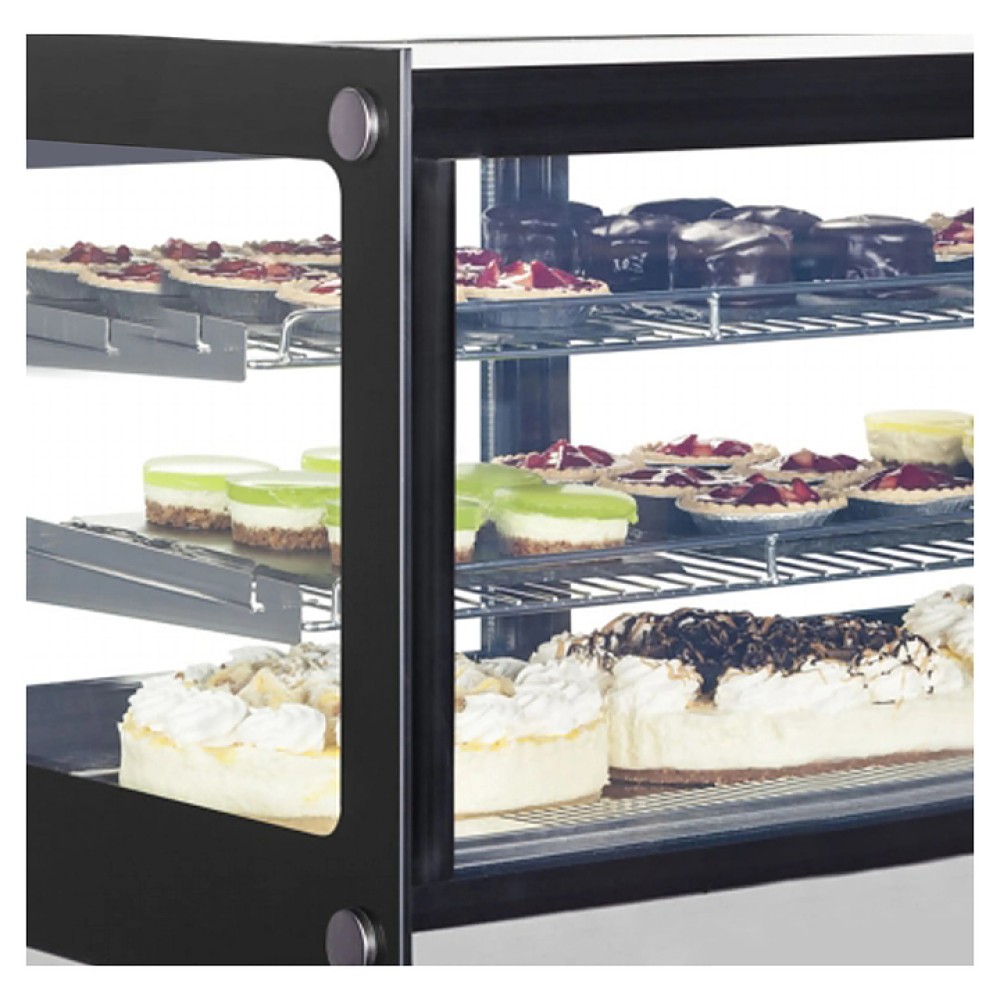 Настольная кондитерская витрина TEFCOLD LCT750F/BLACK предназначена для охлаждения, кратковременного хранения и демонстрации выпечки, тортов, пирожных и пиццы на предприятиях общественного питания и торговли. Модель оснащена 2 раздвижными стеклянными дверцами, 2 решатчатыми хромированными полками, термометром, электронным блоком управления, LED-подстветкой и 4 регулируемыми ножками. Изделие выполнено из нержавеющей стали.